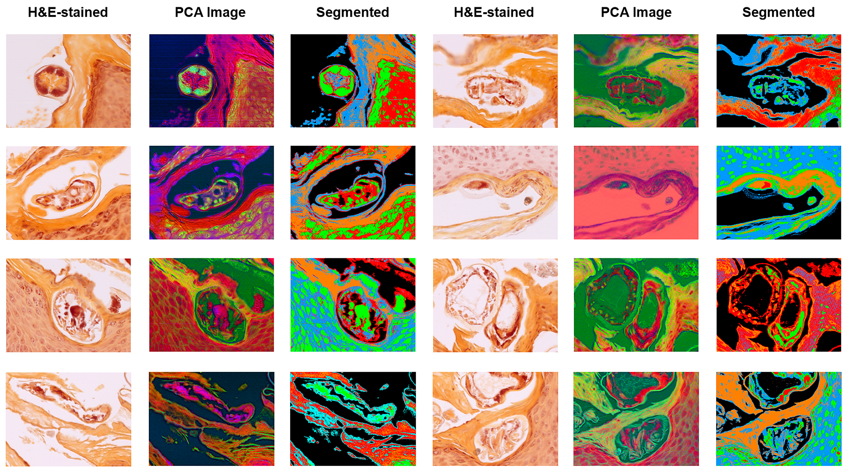 Figure 8. Each row represents a different biopsy sample of human skin with confirmed scabies. The columns illustrate: