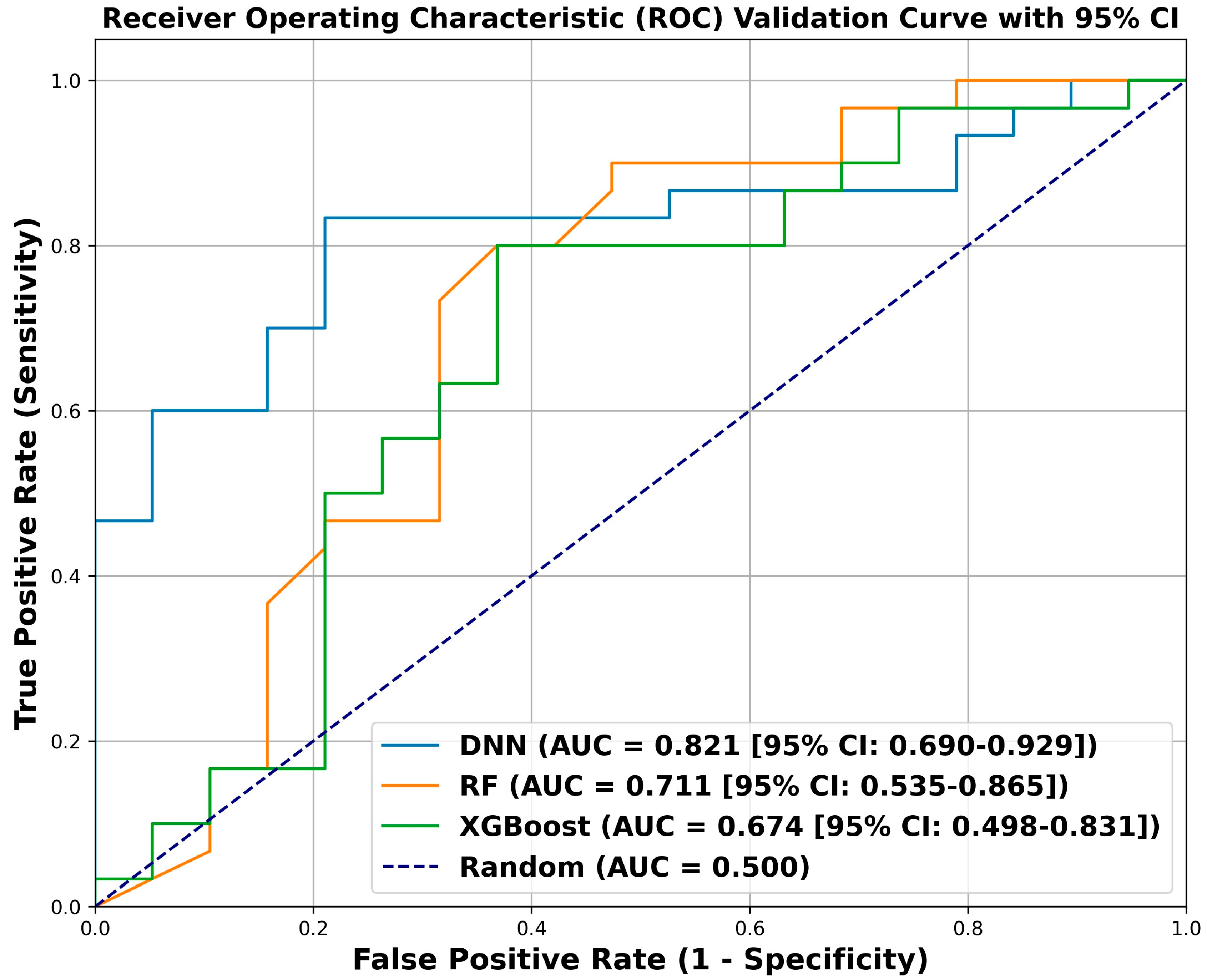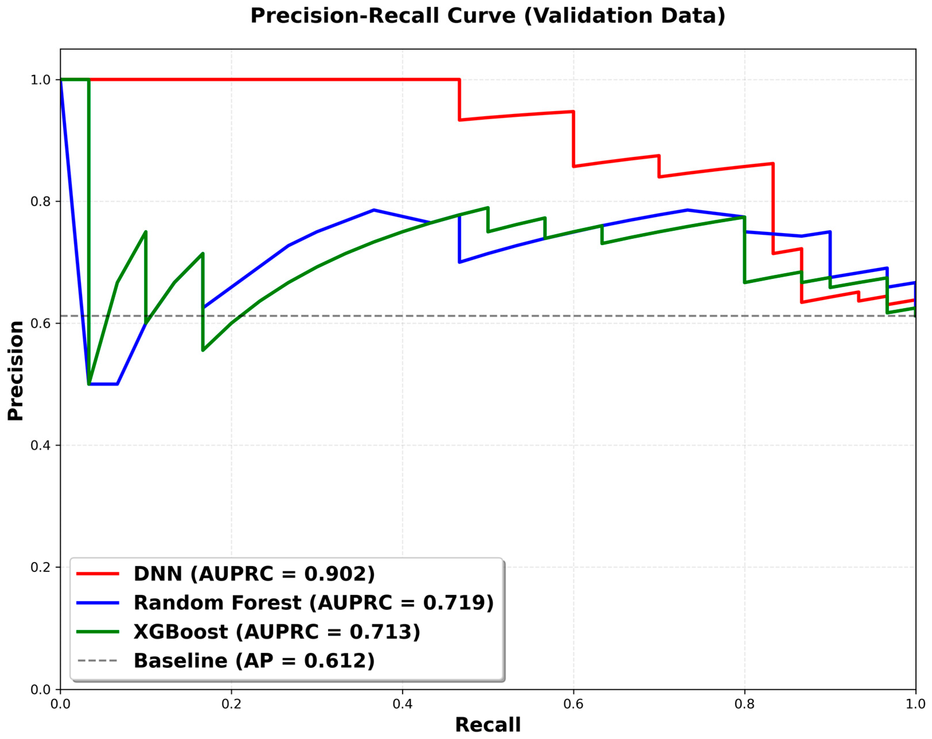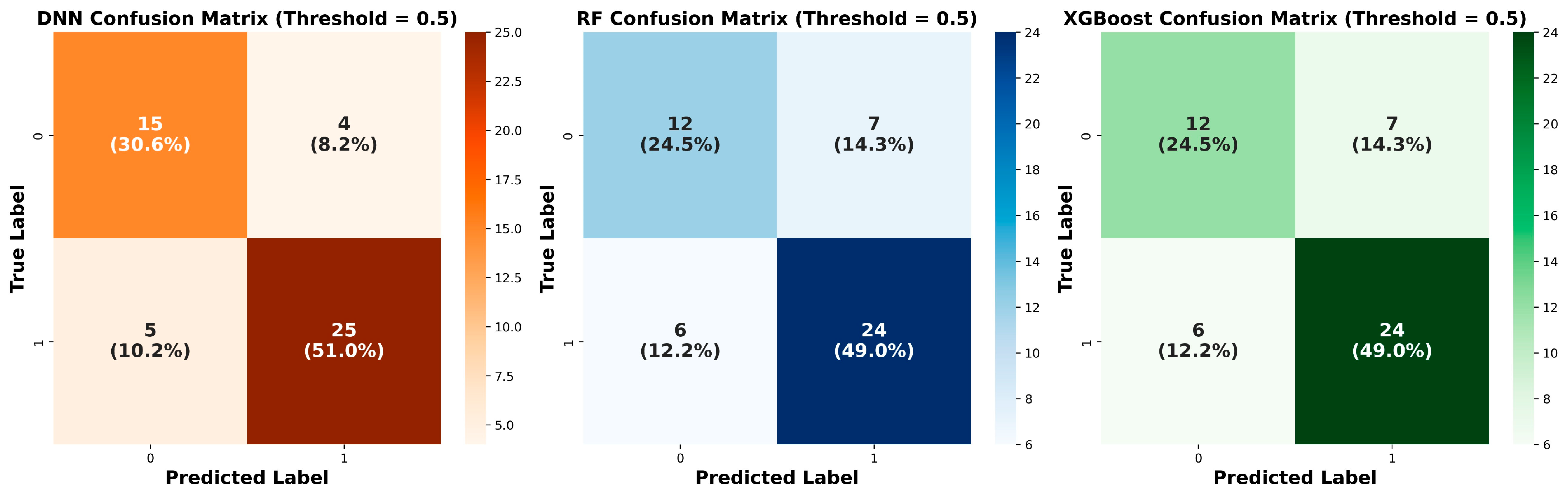 Figure 3 shows the precision–recall curves for the DNN, RF, and XGBoost models. The DNN demonstrated superior diagnostic performance, with an area under the precision–recall curve (AUPRC) of 0.902, markedly outperforming RF (0.719) and XGBoost (0.713). Notably, the DNN maintained perfect precision (1.0) up to a 45% recall threshold, ensuring zero false positives in high-confidence predictions—an important attribute for minimizing clinical alarm fatigue. These results highlight the robustness of the DL architecture in capturing complex nonlinear interactions, enabling precise patient stratification and offering a reliable alternative to conventional ML methods.