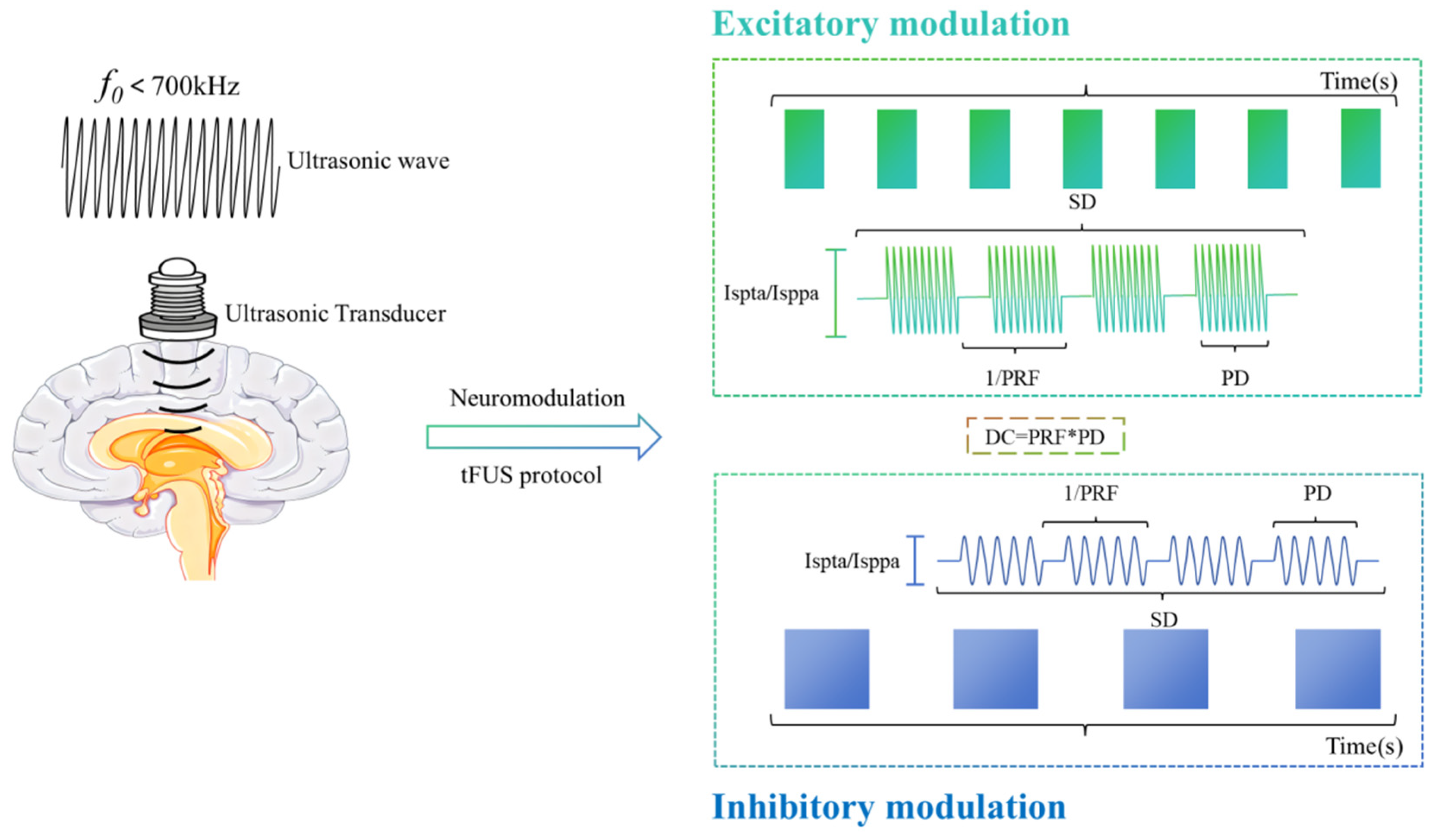 - Zhang, T.; Pan, N.; Wang, Y.; Liu, C.; Hu, S. Transcranial Focused Ultrasound Neuromodulation: A Review of the Excitatory and Inhibitory Effects on Brain Activity in Human and Animals. Front. Hum. Neurosci. 2021, 15, 749162. [Google Scholar] [CrossRef]