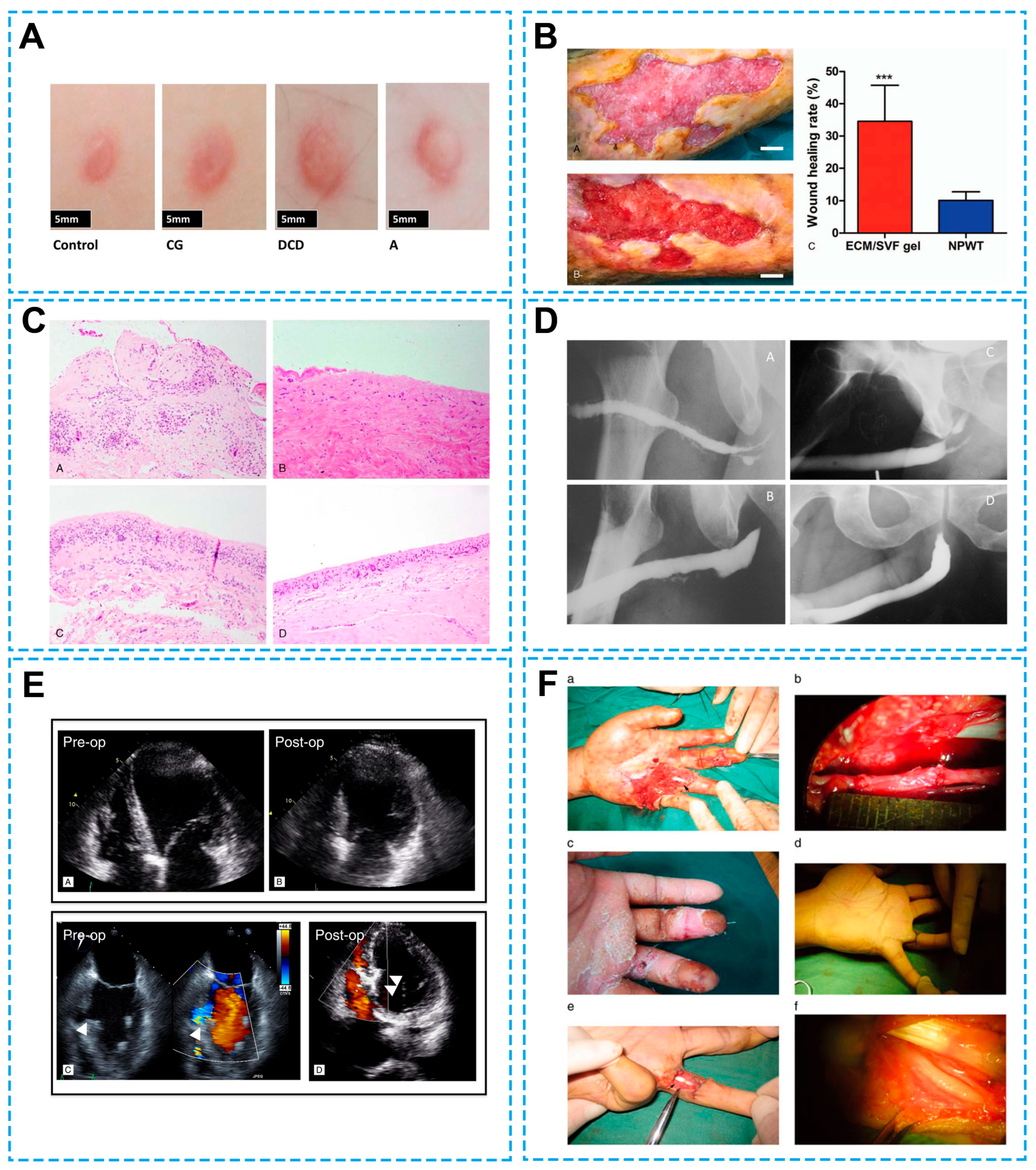 | Wound healing | OASIS® (SIS) | Evergen (formerly Cook Biotech, Alachua, FL, USA) | Commercially available for acute and chronic wound treatment | - | |
