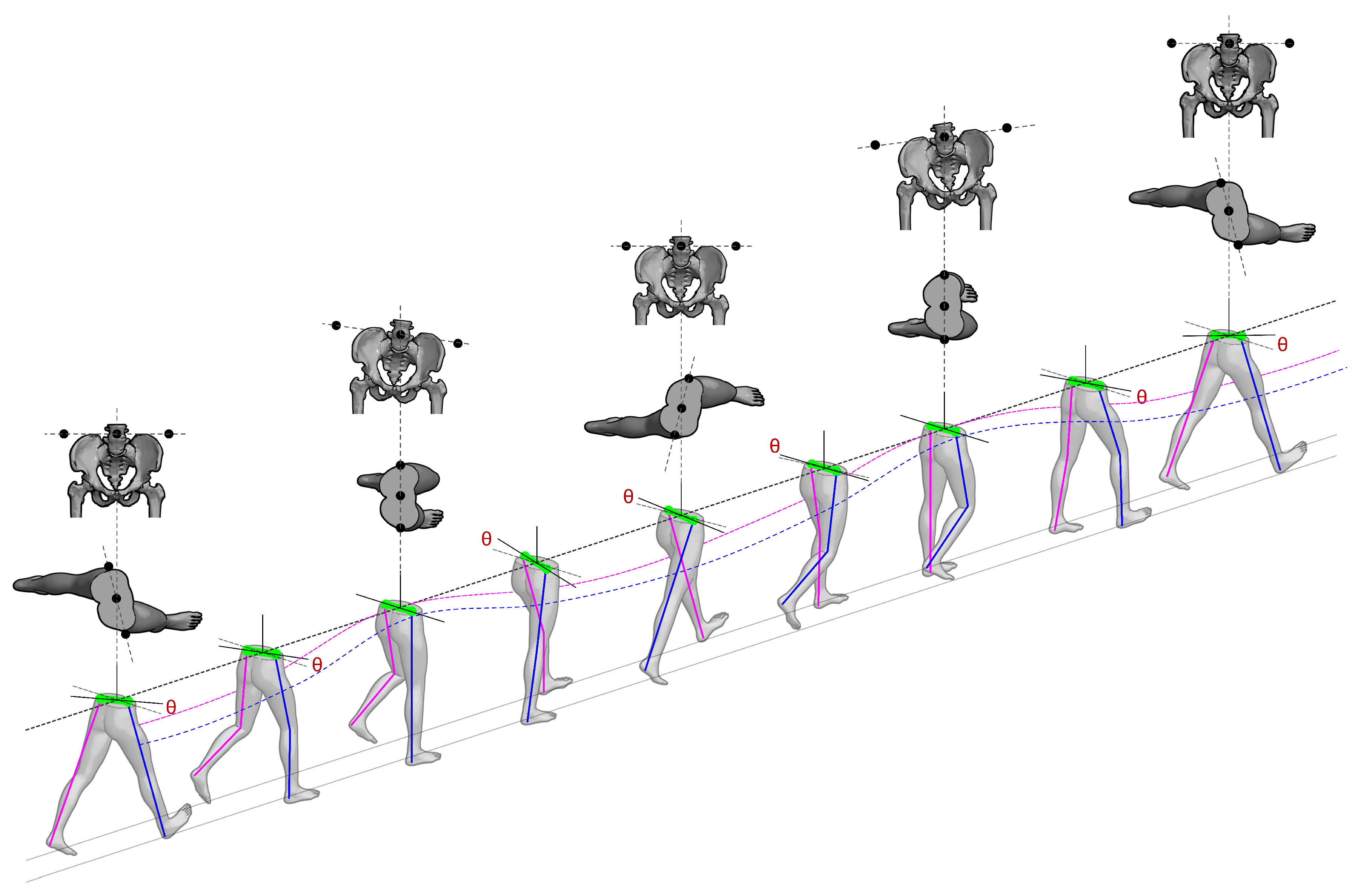 Furthermore, the pelvis, serving as the link between the two pendulums, transmits forces that maintain balance and stability during gait and functions as the support base for the legs. Its position and orientation vary to optimize displacement efficiency and determine step length. Therefore, movements must be considered not only in the sagittal plane but also in the frontal and transverse planes. Specifically, pelvic tilt toward the stance leg in the frontal plane and counter-rotation of the swinging leg in the transverse plane are key to understanding overall displacement and ensuring smooth transitions between steps [