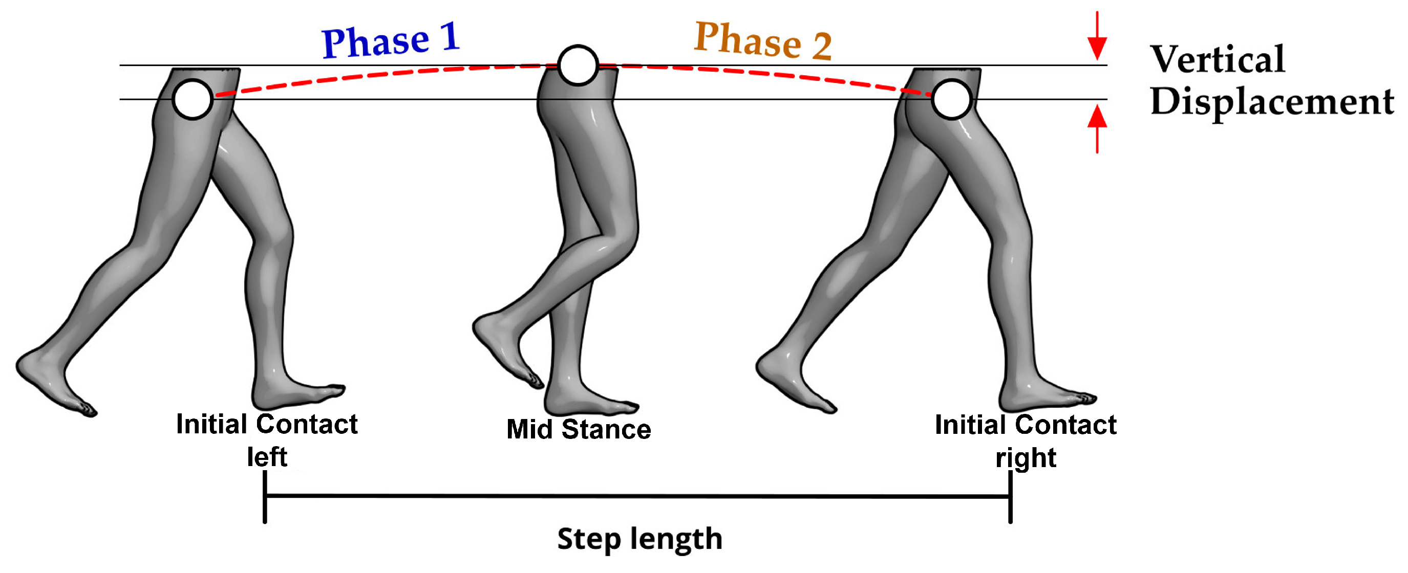 15], which relies on double integration of the vertical acceleration to estimate changes in the center-of-mass height combined with leg length. The results showed a mean step length of 78.63 ± 9.30 cm in young adults and 79.83 ± 9.80 cm in older adults. The authors concluded that, although the agreement between their calculated step lengths and those measured by the pressure platform and video system was good, concordance in variability, asymmetry, and left-versus-right step detection was poor—not because of sensor inaccuracy, but due to the formula’s inability to account for asymmetric gait patterns or center-of-mass tilts. This highlights the critical need for a model that, rather than assuming symmetry, can capture the individual dynamics of each limb.