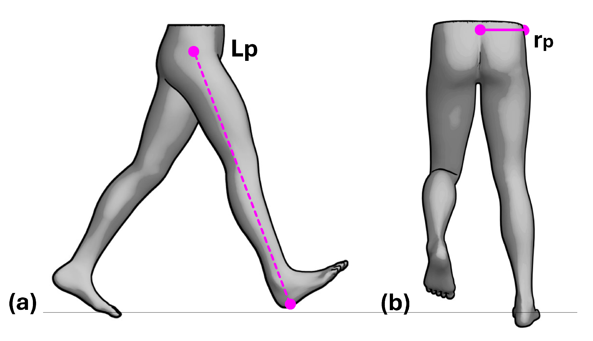 : Represents the rotational pelvic component. This term is our key contribution to capturing asymmetry and represents the additional (or subtracted) length generated directly by the rotation of the pelvis in the transverse plane—a factor that, as we have discussed, is crucial for accurate estimation.