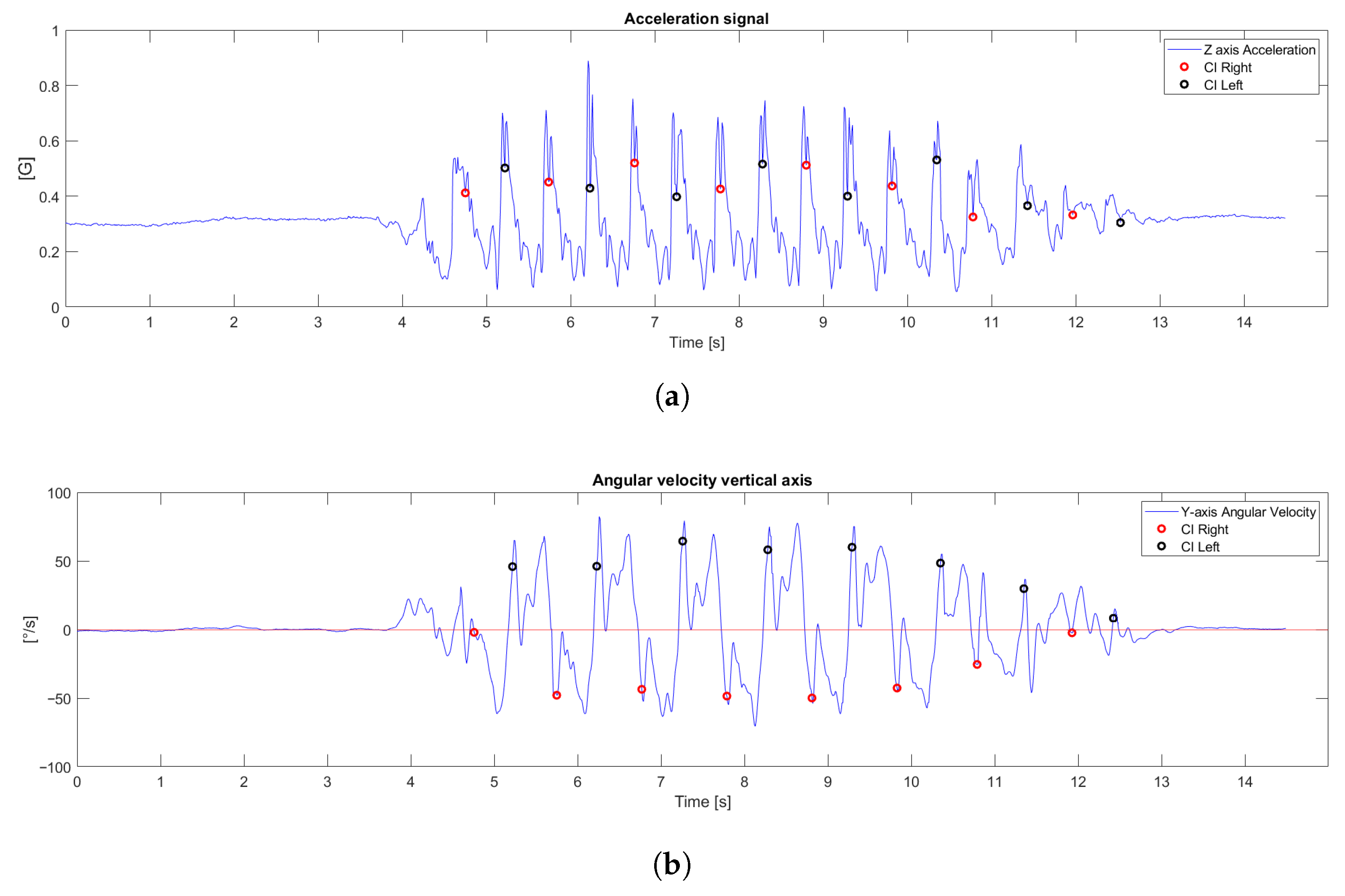14] recruited 80 adult volunteers and divided them into two groups of 40 participants: the first group consisted of healthy young adults aged 20 to 40 years, and the second comprised older adults aged 50 to 70 years. Each participant wore an inertial sensor sampling at 100 Hz, mounted at the level of the L5 vertebra on the lower back using a dual-strap belt. In addition, they walked over a GAITRite pressure platform sampling at 240 Hz while being recorded by a video camera at 25 fps. Participants were asked to walk at their self-selected speed for two minutes along a 25 m circuit. After data collection, the signals were processed in MATLAB 2012: gait segmentation was performed by applying a Wavelet Transform to the vertical acceleration to identify Heel Strike (Initial Contact, IC), and then the derivative of that signal was used to detect Toe Off (Final Contact, FC), corresponding to the minima and maxima of their respective acceleration profiles. Step length was computed using the simple inverted pendulum model described in [
