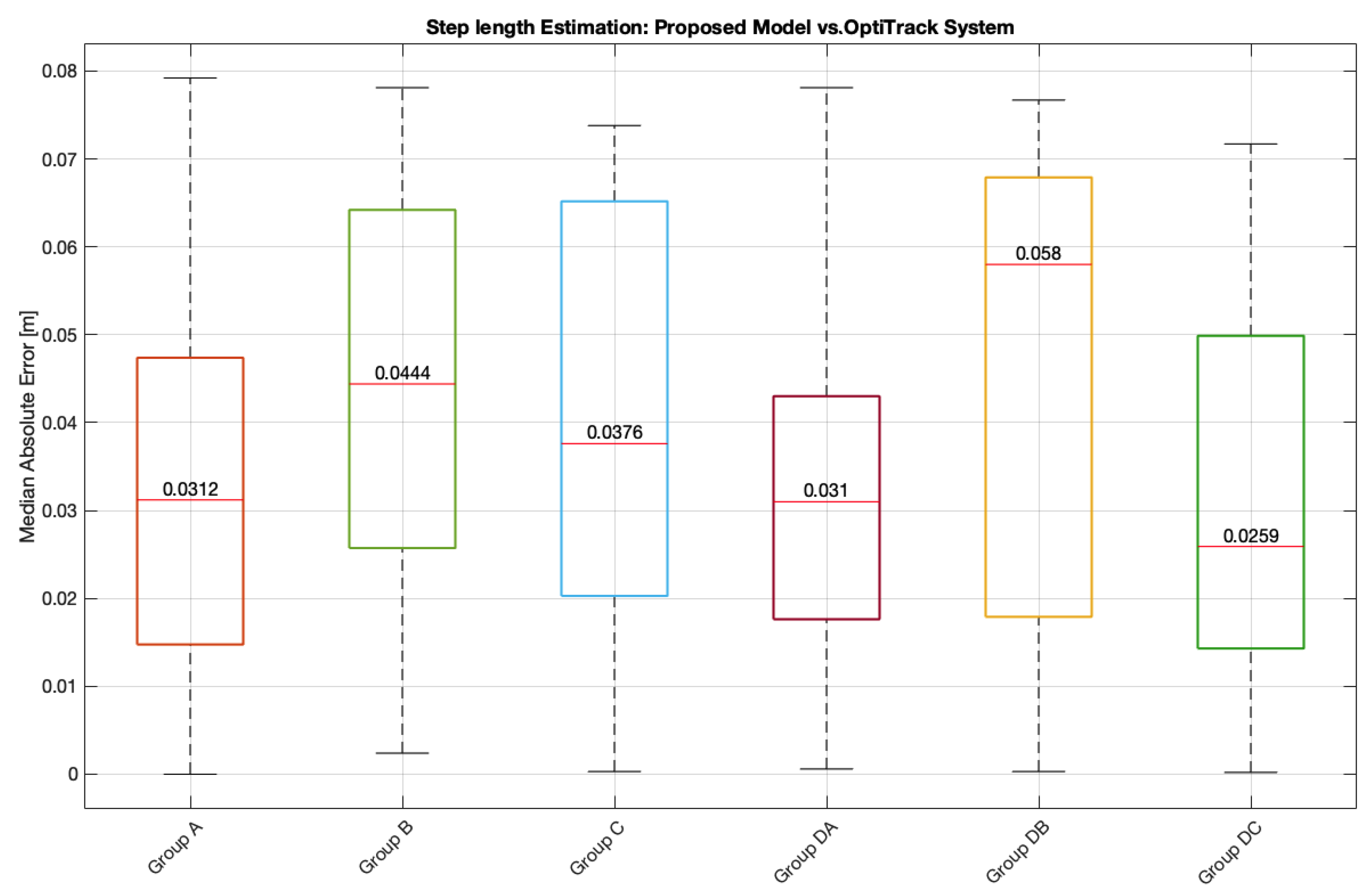 These results indicate that the model maintains robust precision across all groups, with no marked differences between participants with and without gait dysfunction. Furthermore, the fact that the vast majority of median errors remain low highlights the stability of the proposed model for estimating step length under varying gait conditions.