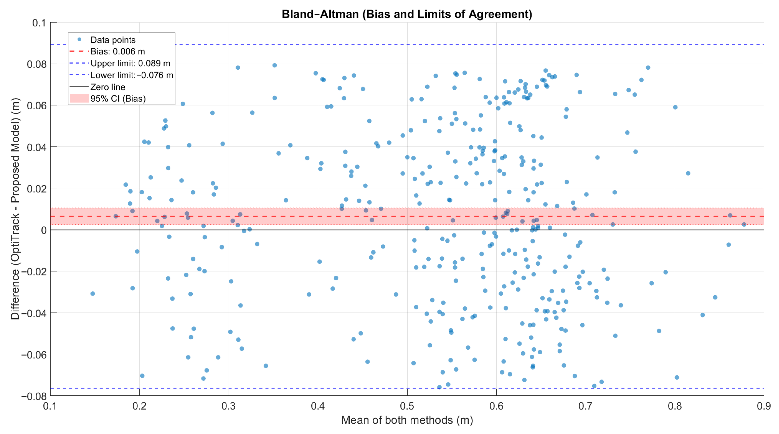 Figure 12) were performed. The Bland–Altman plot revealed a mean bias of 0.0064 m (95% CI [0.0019, 0.0104] m), with limits of agreement between −0.0763 m and 0.0891 m, resulting in an overall agreement range of 0.1655 m. The correlation analysis confirmed a strong linear relationship (R = 0.9647, R