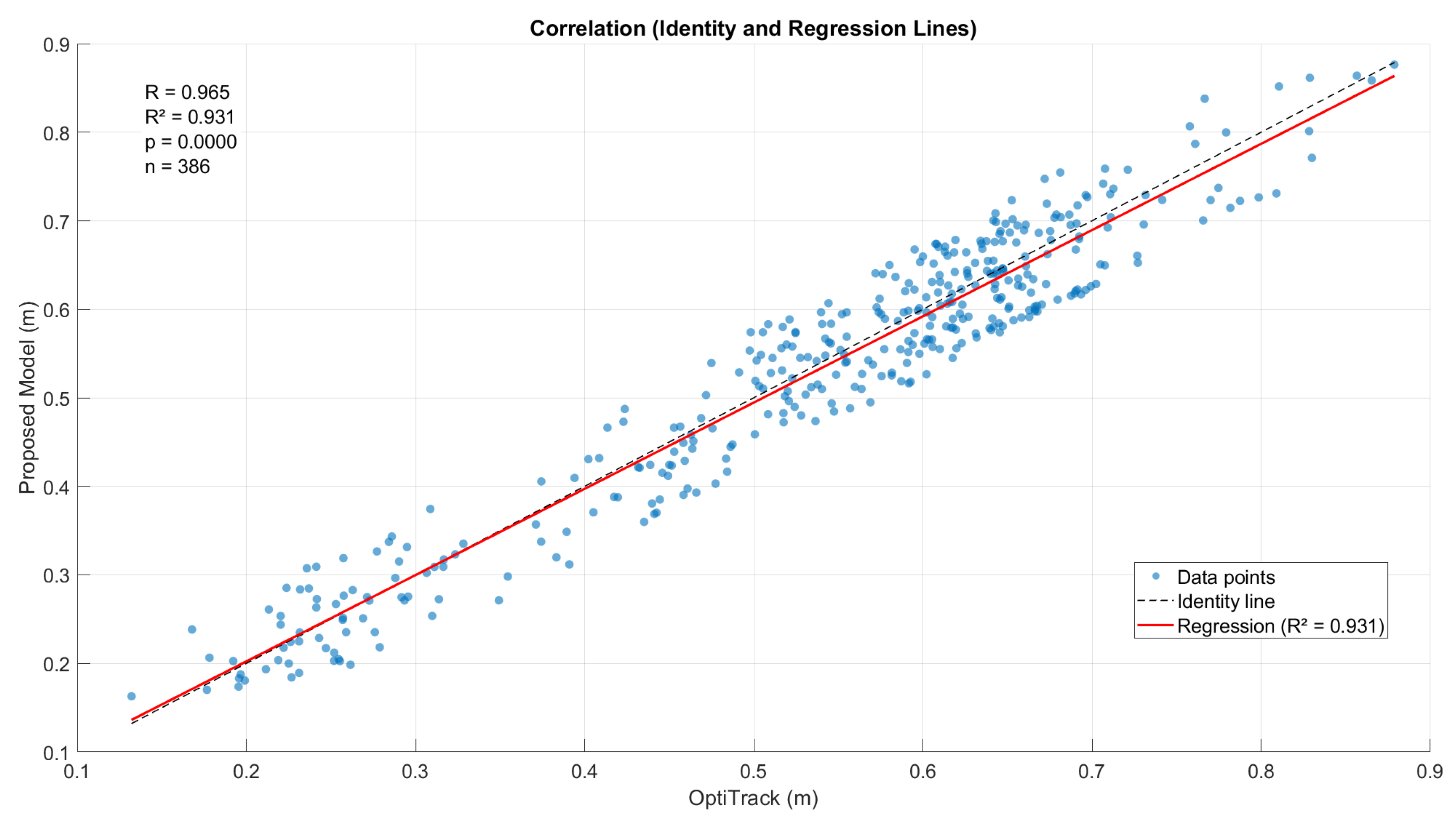 p < 0.001), with a regression slope of 0.9742 and an intercept of 0.0075. These findings demonstrate that the proposed model accurately reproduces step length measurements with minimal systematic bias and high consistency across all tested subjects.