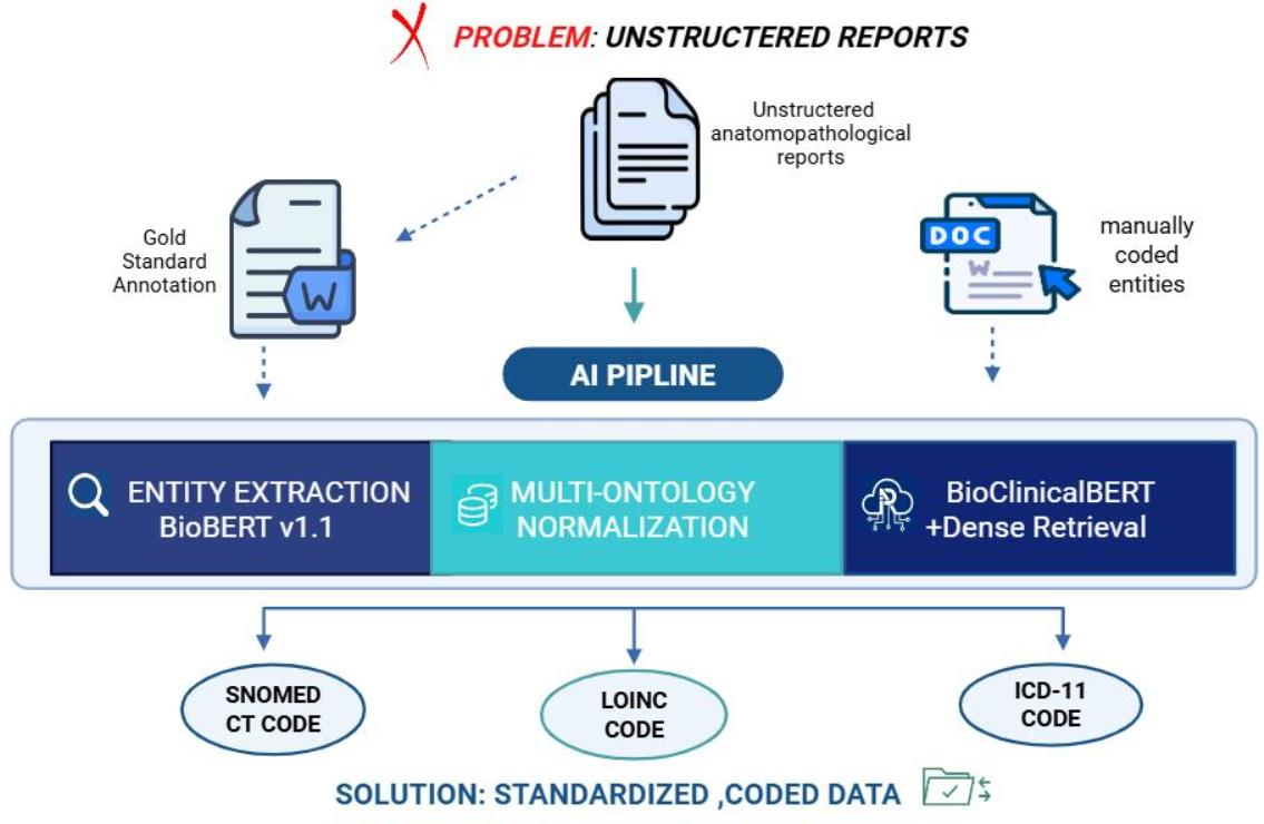 11]. A pivotal yet underexplored application is the semantic processing and standardization of unstructured clinical text. This work addresses that gap by focusing on anatomic pathology reports, where AI can automate the labor-intensive bottleneck of coding, thereby enabling data interoperability for research and clinical workflows.