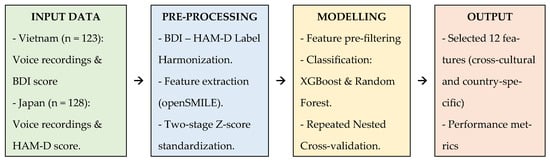 To address these empirical gaps, this study aims to: (1) systematically identify a robust set of Vietnamese-specific acoustic features for depression assessment; (2) establish a parallel set of Japanese-specific features; and (3) derive and validate a core set of cross-culturally consistent acoustic features using datasets from both nations. We hypothesize that a subset of acoustic features, primarily those reflecting physiological vocal tract dynamics and neuromuscular control rather than prosodic linguistic elements, will demonstrate consistent discriminative power across both Vietnamese and Japanese contexts. This research seeks to contribute to the development of culturally attuned yet universally applicable vocal biomarkers for mental health.
