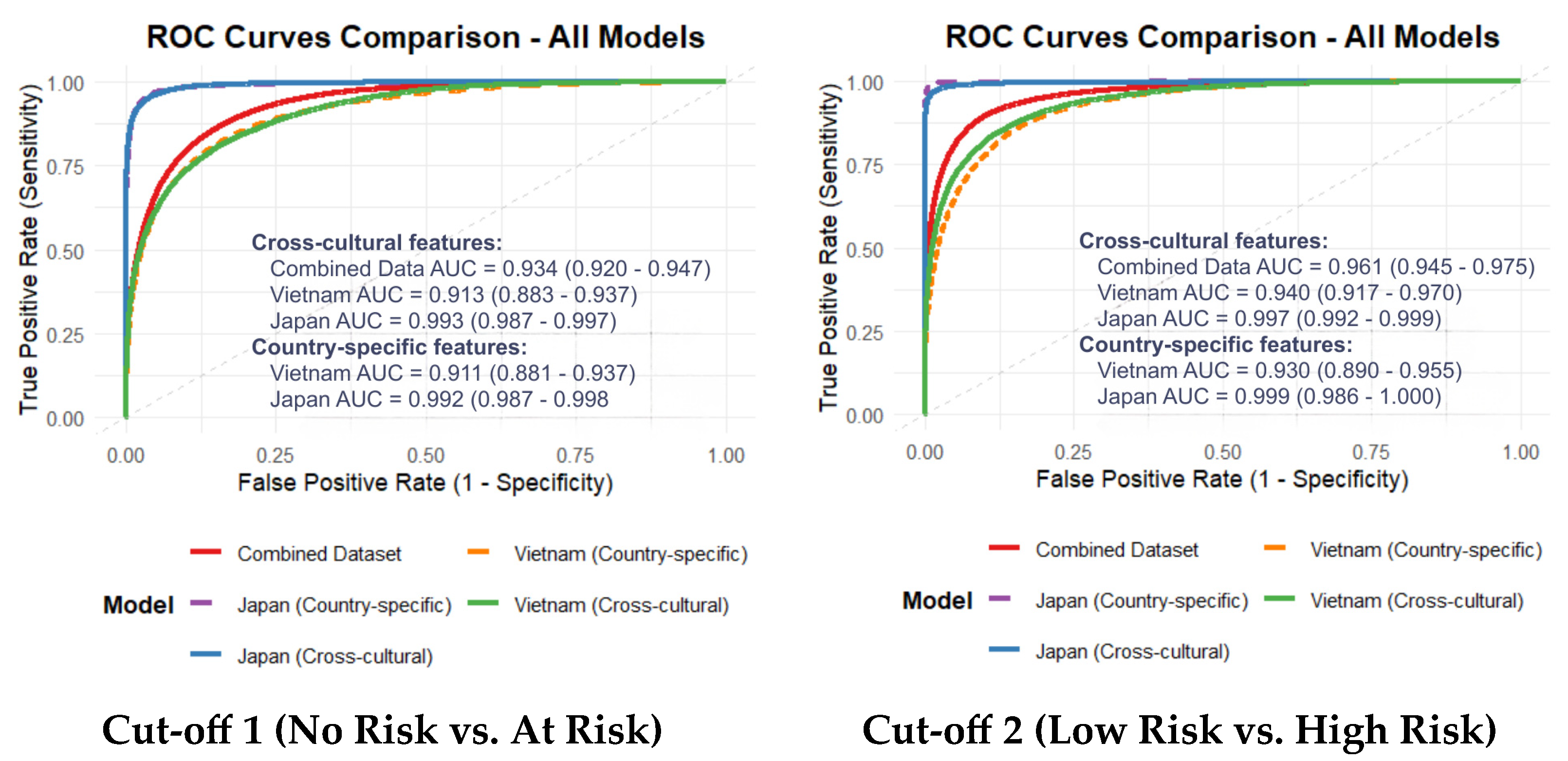 Notably, the cross-cultural model’s performance was comparable to the language-specific models within this two-country context. For the Vietnamese dataset, the cross-cultural AUC (0.913) was similar to the country-specific model (0.911), showing stable performance even at Cut-off 2. These results suggest that our feature selection approach potentially mitigates some linguistic variance by identifying features with consistent patterns across both Vietnamese and Japanese datasets. The robustness of this feature set is further supported by its consistent performance across different machine learning algorithms. While XGBoost was chosen as the primary model for its optimal balance of performance and efficiency, a comparative analysis with a Random Forest classifier revealed that the feature set maintained robust discriminative power, indicating that the predictive signal is inherent to the acoustics and not an artifact of a specific algorithm.