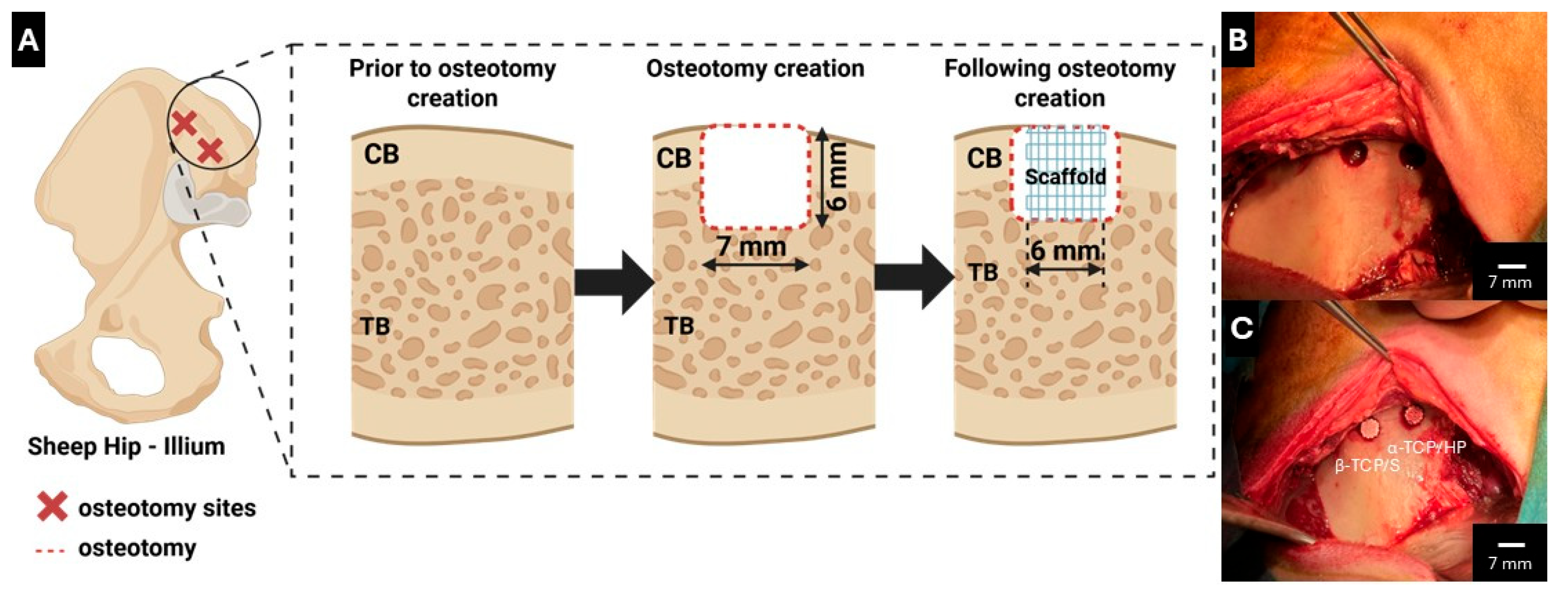- Wiltfang, J.; Merten, H.A.; Schlegel, K.A.; Schultze-Mosgau, S.; Kloss, F.R.; Rupprecht, S.; Kessler, P. Degradation characteristics of α and β tri-calcium-phosphate (TCP) in minipigs. J. Biomed. Mater. Res. 2002, 63, 115–121. [Google Scholar] [CrossRef] [PubMed]