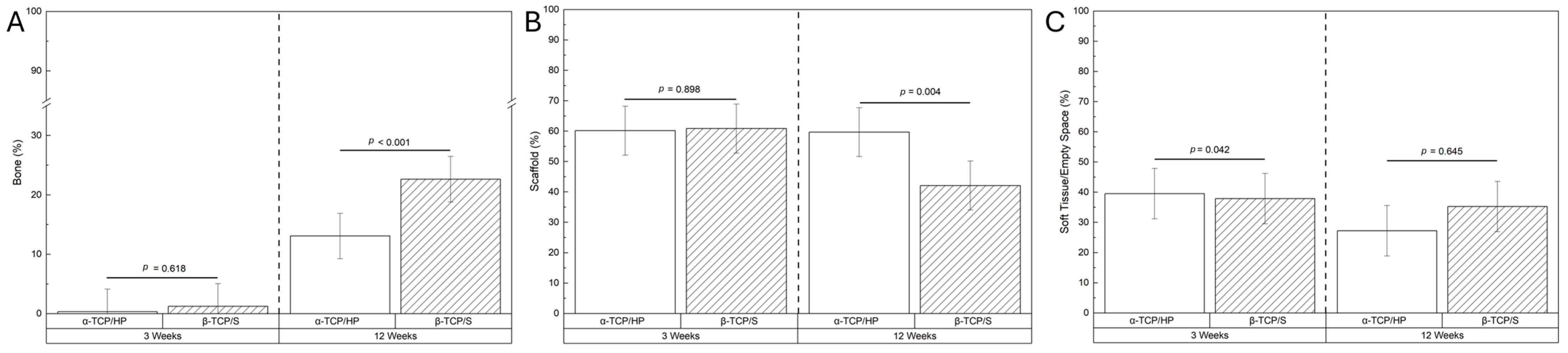- Shen, C.; Wang, M.M.; Witek, L.; Tovar, N.; Cronstein, B.N.; Torroni, A.; Flores, R.L.; Coelho, P.G. Transforming the Degradation Rate of β-tricalcium Phosphate Bone Replacement Using 3-Dimensional Printing. Ann. Plast. Surg. 2021, 87, 153–162. [Google Scholar] [CrossRef] [PubMed]