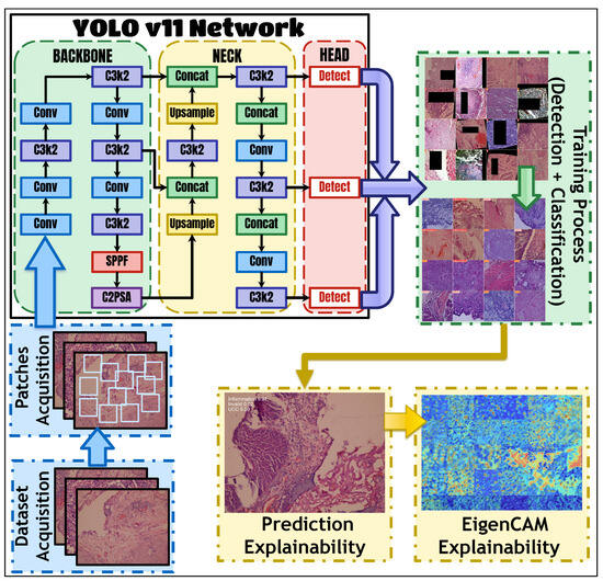 Experiments were conducted in a Windows 11 (64-bit) OS environment with a NVIDIA GeForce RTX 3050 (4 GB VRAM) manufactured by NVIDIA Corporation (Santa Clara, CA, USA), and 128 GB RAM. Although relatively modest, this setup was sufficient for training and evaluating the YOLOv11 models on image patches rather than whole-slide images. The software environment included Python 3.10, the Ultralytics YOLOv11 framework for model development, and PyTorch (version 2.1.0) with CUDA-enabled acceleration. EigenCAM, implemented through PyTorch-CAM, was used to generate Class Activation Maps and provide visual interpretability of model predictions. Additional libraries such as OpenCV, NumPy, SciPy, Pandas, and scikit-learn supported preprocessing, numerical computation, and performance evaluation. All development and experimentation were conducted using Jupyter Notebook (version 7.0.6) and Visual Studio Code (version 1.85.1) on Windows 11. For model evaluation, we used five variants of the YOLOv11 architecture, YOLOv11-nano, YOLOv11-small, YOLOv11-medium, YOLOv11-large, and YOLOv11-xlarge, which differ in their parameter counts.