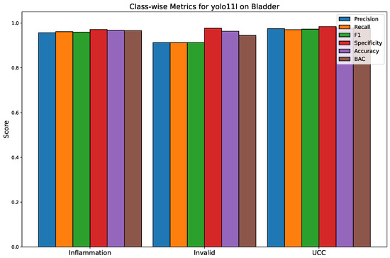 Class-wise performance metrics for the YOLOv11-large model. This bar chart compares the precision, recall, F1 score, specificity, accuracy, and BAC for each of the three classes: inflammation, invalid, and UCC.