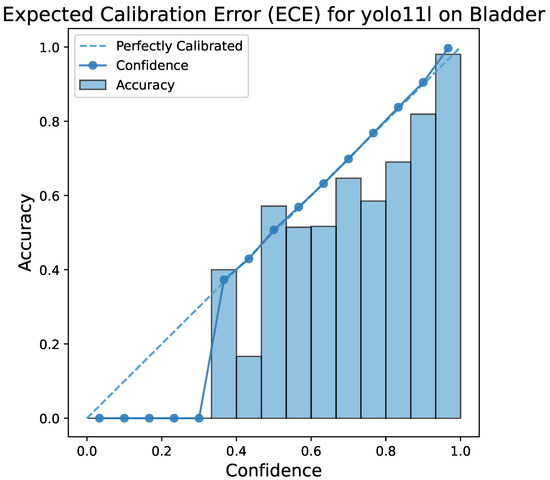Figure 5 demonstrates the Expected Calibration Error (ECE) of the YOLO11l model. A small ECE figure means that the model’s predicted probabilities are in good agreement with the actual outcomes; e.g., if the model predicts the class with 95% confidence, it is correct 95% of the time. Such calibration is very important for the acceptance of a decision support system in medical diagnosis because clinicians not only depend on the predicted label but also on the confidence score for making their decisions.