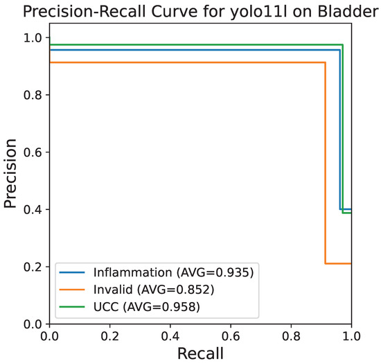 PR curve for the YOLOv11-large model on the bladder histopathology classification task. The area under the PR curve for each class is shown: inflammation (0.935), invalid (0.852), and UCC (0.958), indicating high performance even on imbalanced data.