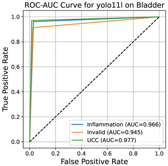 Figure 7 represents the ROC curve together with the AUC for the YOLO11l model. The ROC curve shows the true positive rate (TPR, or sensitivity) as a function of the false positive rate (FPR, or 1 − specificity) at different classification thresholds. The overall AUC for the multi-class problem is derived by the One-vs.-Rest (OvR) method, resulting in a value of 0.972. Such a high AUC score indicates that the model possesses an excellent capability of differentiating between the three classes; therefore, its performance is far better than that of a random guess (which would result in an AUC of 0.5). The almost perfect curves for the inflammation and UCC classes, together with a slightly lower but still very strong curve for the invalid class, confirm the model’s general power of diagnosis.