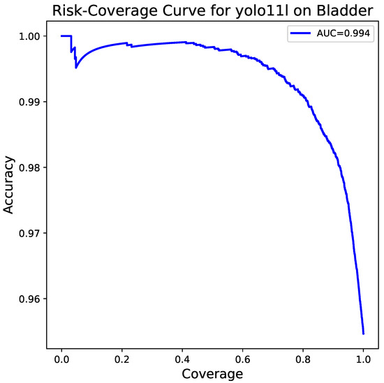 Risk–coverage curve for the YOLOv11-large model. The AUC of 0.994 demonstrates the model’s exceptional reliability, maintaining high accuracy across a wide range of coverage thresholds.