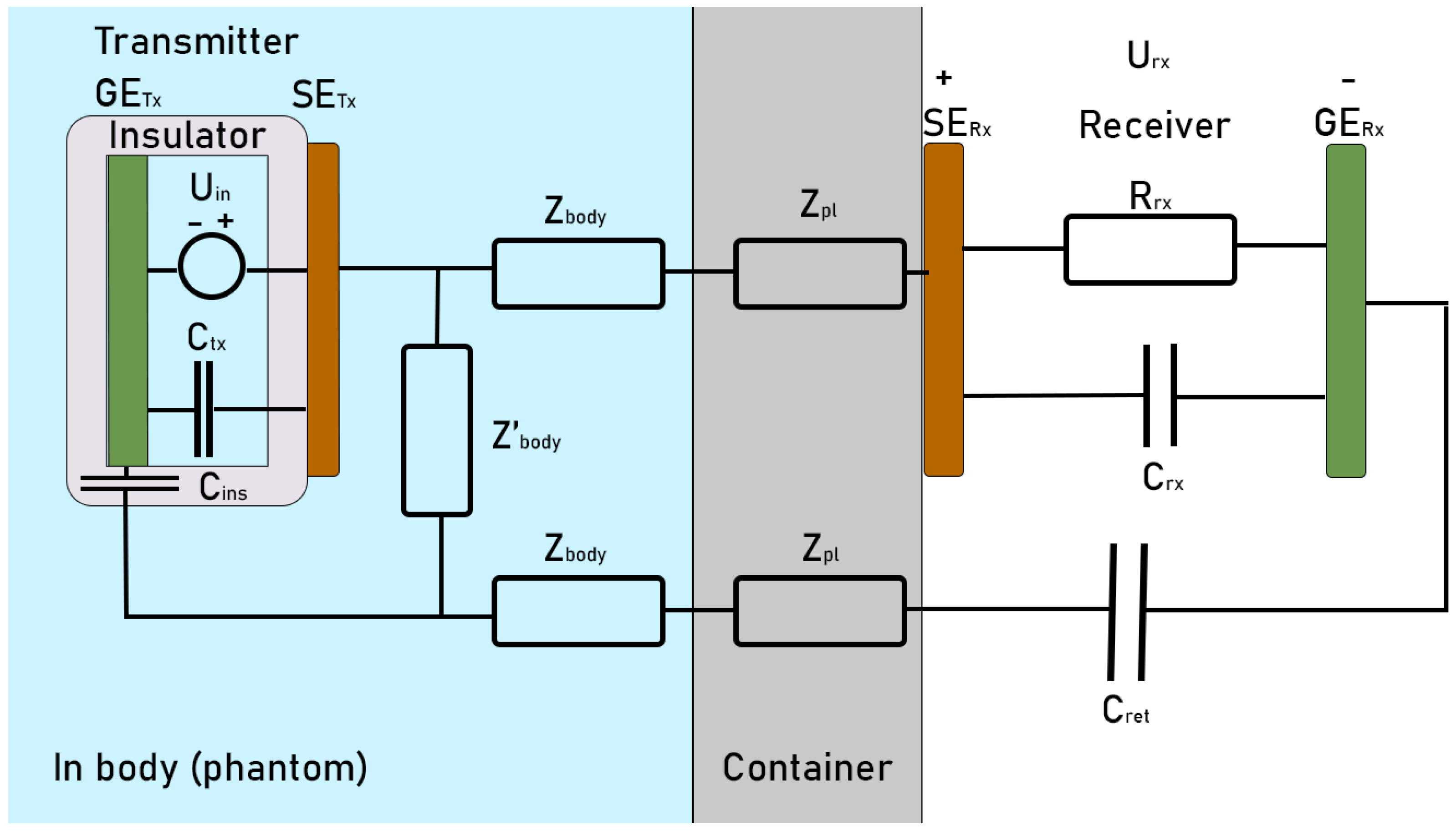 - Roglić, M.; Gao, Y.; Artić, I.; Lučev Vasić, Ž. Characterization of Implantable Capacitive Intrabody Communication Channel between In-body and On-body Devices on a Liquid Phantom. In Proceedings of the 2023 IEEE International Symposium on Medical Measurements and Applications (MeMeA), Jeju, Republic of Korea, 14–16 June 2023; IEEE: Solaris, Singapore, 2023; pp. 1–6. [Google Scholar] [CrossRef]