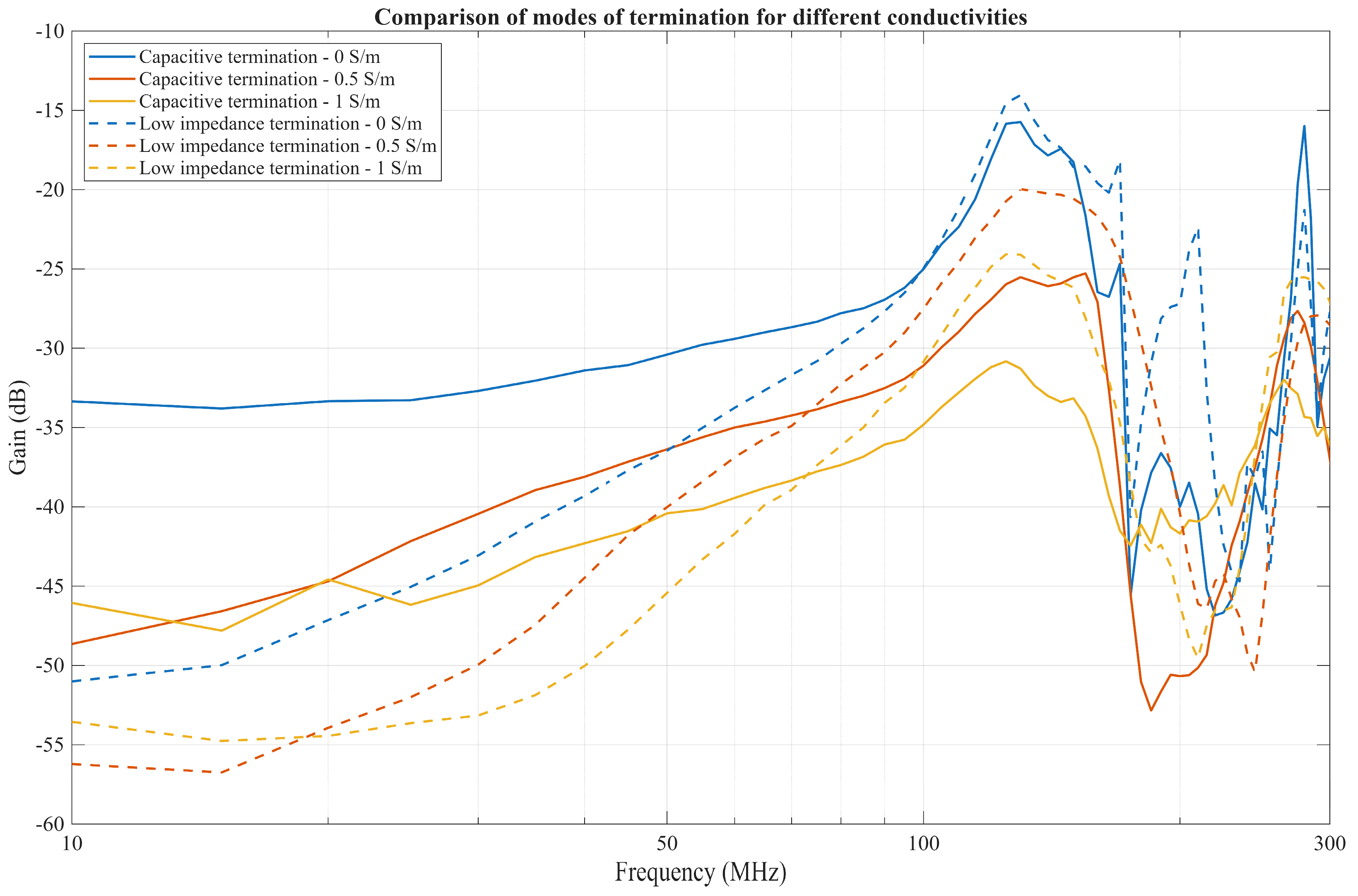 4.3. Comparison of Low Resistance Termination and Capacitive Termination