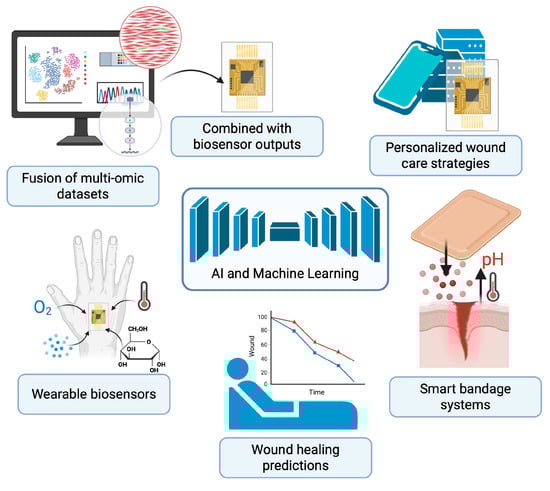 AI models are also being developed for predictive analytics, aiming to forecast wound healing outcomes based on both clinical and molecular variables. Supervised learning techniques, including support vector machines and gradient-boosted trees, are being trained on multi-omic and electronic health record (EHR) data to stratify patients into healing risk categories and predict chronicity [118,119]. Studies have demonstrated that time-series machine learning models could predict non-healing diabetic ulcers four weeks in advance with high accuracy and higher AUROC scores than other statistical predictive models [120]. In parallel, the concept of the “digital twin”—a computationally dynamic and biologically personalized model of a patient’s wound—is gaining traction [121,122,123]. These in silico frameworks integrate omic inputs with mechanistic wound models to simulate healing responses under various interventions, potentially guiding personalized therapy in real-time. A recent example is the Wound Environment Agent-Based Model (WEABM), which combines transcriptomic and immunologic data to simulate and characterize volumetric tissue regeneration under experimental treatments [124].