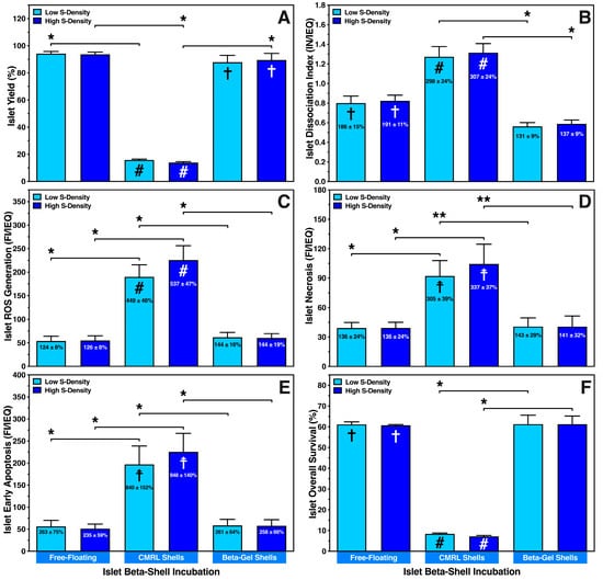 Effect of seeding density (S-Density) on characterisation of islets cultured at a density of 300 (low) or 600 (high) IEQ in silicone-based multi-scale porous macrodevices loaded with 300 µL of supplemented CMRL (CMRL shells) or O2-charged beta-gel (beta-gel shells). CMRL-incubated islets cultured in 8 mL of supplemented CMRL in 10 cm Petri dishes served as controls (free-floating). After 4–5 days of normoxic culture (n = 5) islets were characterised regarding (A) islet yield (%) normalised to islet preculture, (B) the islet dissociation index (IN/IEQ), (C) reactive oxygen species (ROS) generation (FI/IEQ), (D) islet necrosis (FI/IEQ), (E) islet early apoptosis (FI/IEQ), and (F) islet overall survival (%). Figures inside bars show data normalised to islet preculture. Symbols inside bars indicate # p < 0.001, ☨ p < 0.01, † p < 0.05 for comparison vs. islet preculture. Lines/arrows indicate * p < 0.05, ** p < 0.01 for comparison of experimental groups.