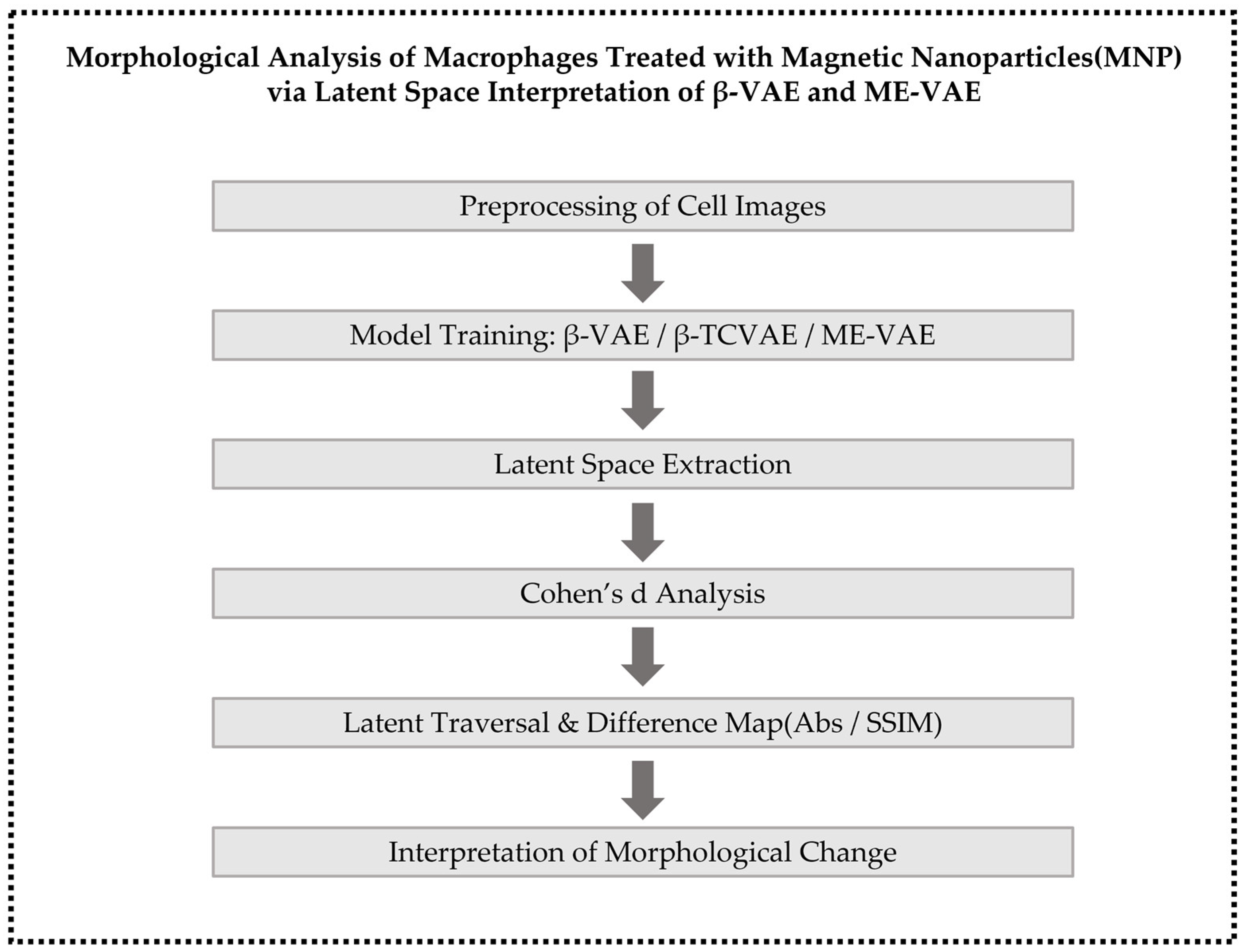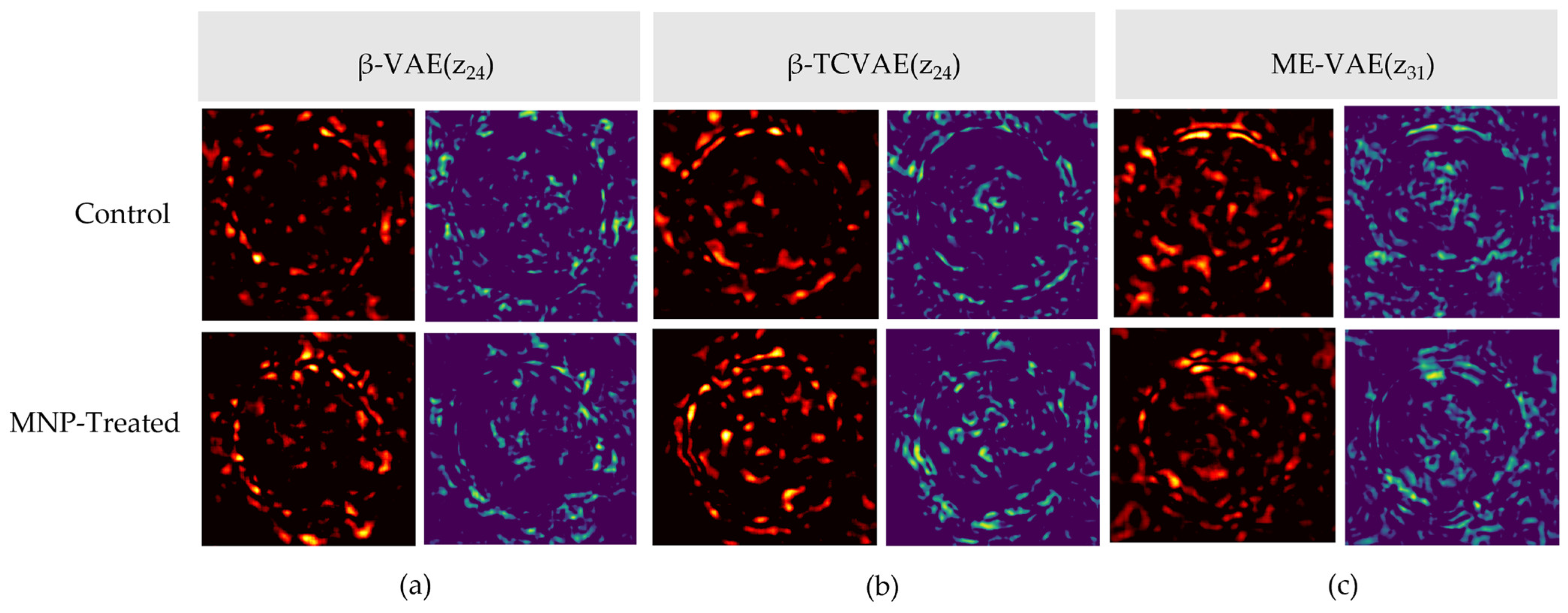 Against this background, the present study developed an unsupervised learning pipeline to analyze morphological changes in macrophages induced by MNP treatment. This pipeline was designed based on phase-contrast microscopy, which serves as a non-invasive and label-free imaging approach. Building on this imaging platform, the analysis focused on multiple VAE-based models, namely β-VAE, β-total correlation VAE (TCVAE), and multi-encoder VAE (ME-VAE), with respect to their disentanglement capacity and interpretability [