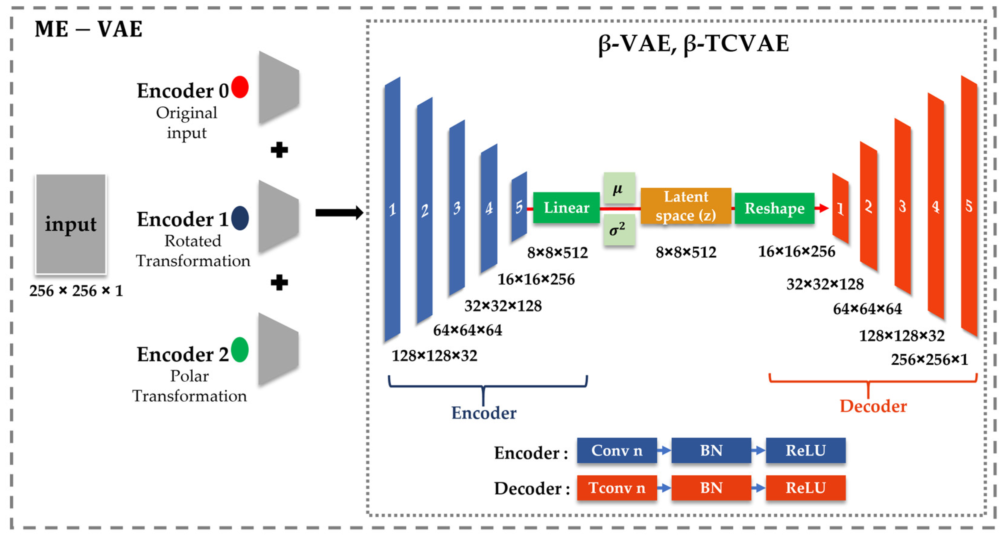 The three image variants (original, rotated, and polar-transformed) were processed in parallel and integrated into a unified latent vector. Latent dimensionality was set to 32 for the β-VAE and β-TCVAE, whereas the ME-VAE was evaluated using both 32 and 64 dimensions. The primary training configurations are summarized in