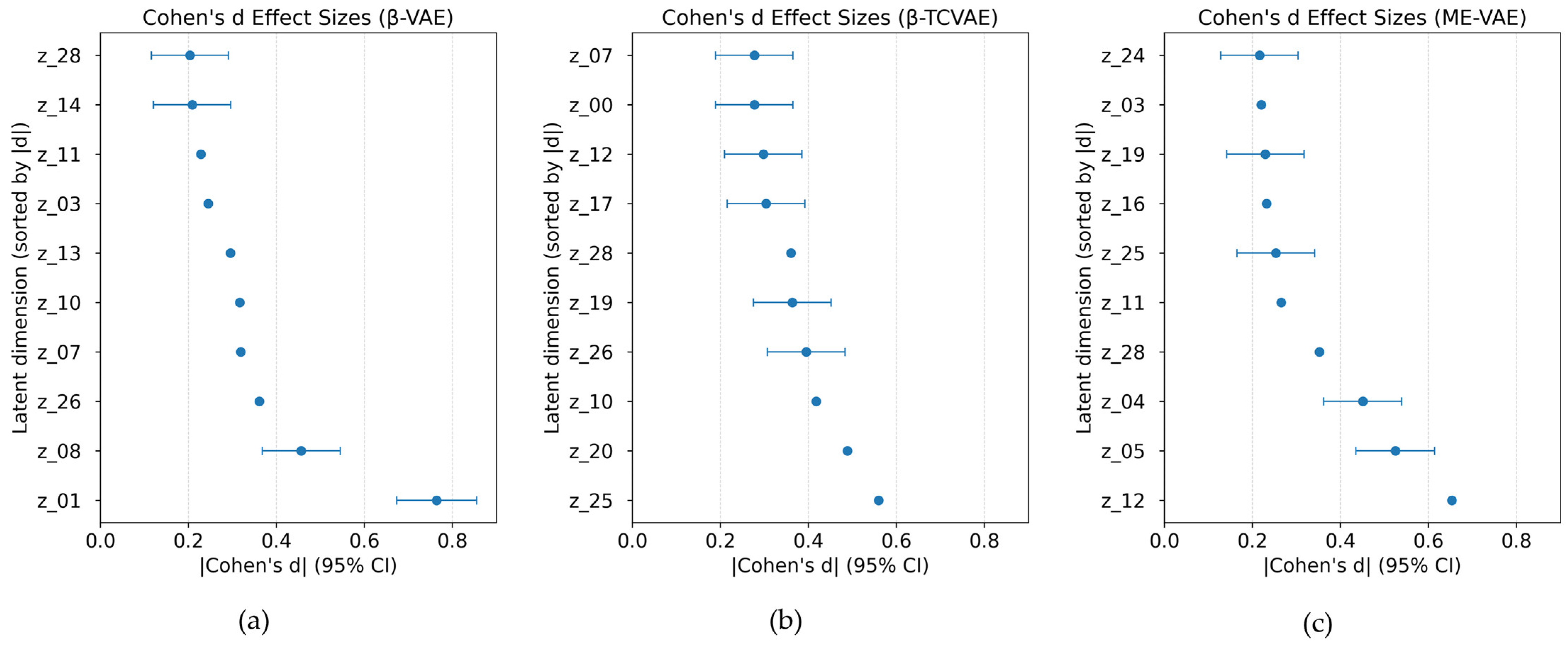 Forest plots of Cohen’s d effect sizes across latent dimensions for control and magnetic-nanoparticle (MNP)-treated macrophages: the (a) β-VAE, (b) β-TCVAE, and (c) ME-VAE. Error bars represent 95% confidence intervals.