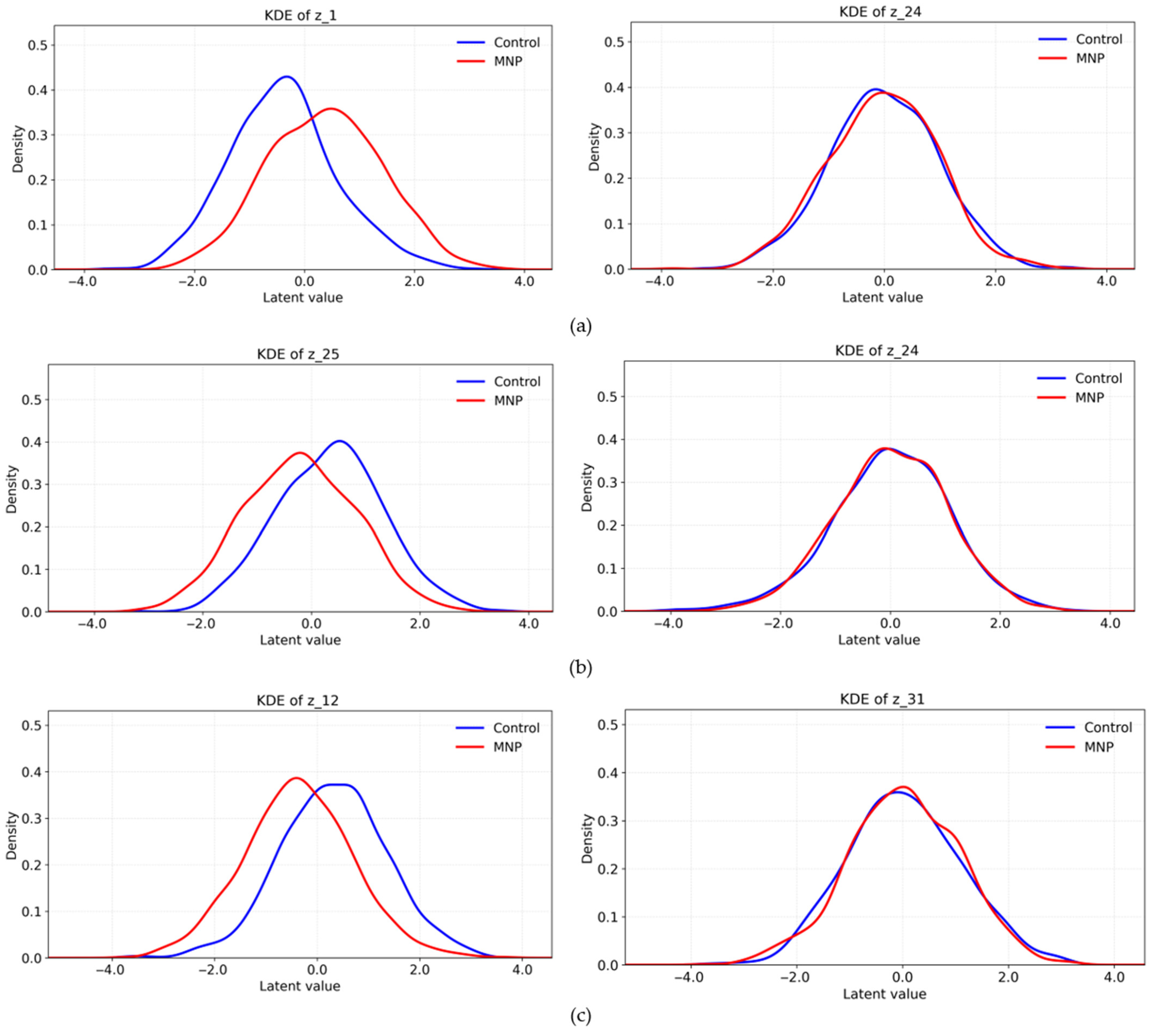 Kernel density estimation plots of representative latent dimensions for the control and MNP-treated macrophages: the (a) β-VAE, (b) β-TCVAE, and (c) ME-VAE.
