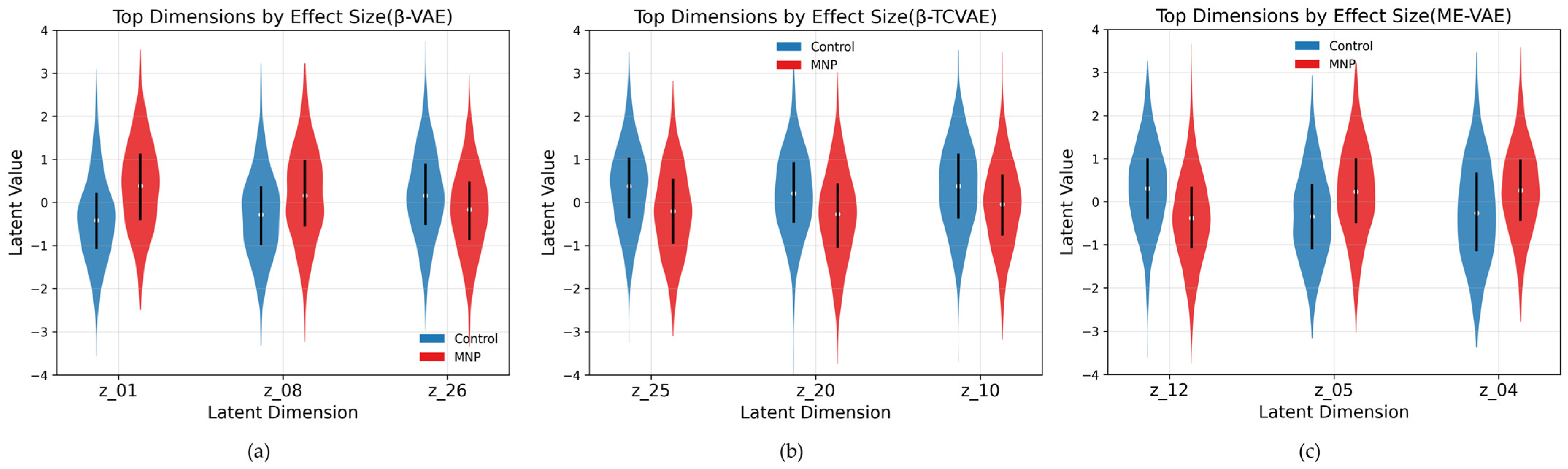 Violin plots of the top latent dimensions ranked by Cohen’s d effect size for the control and MNP-treated macrophages in the (a) β-VAE, (b) β-TCVAE, and (c) ME-VAE. White dots denote medians, black bars indicate interquartile ranges, and the width of each shape reflects the distribution density.