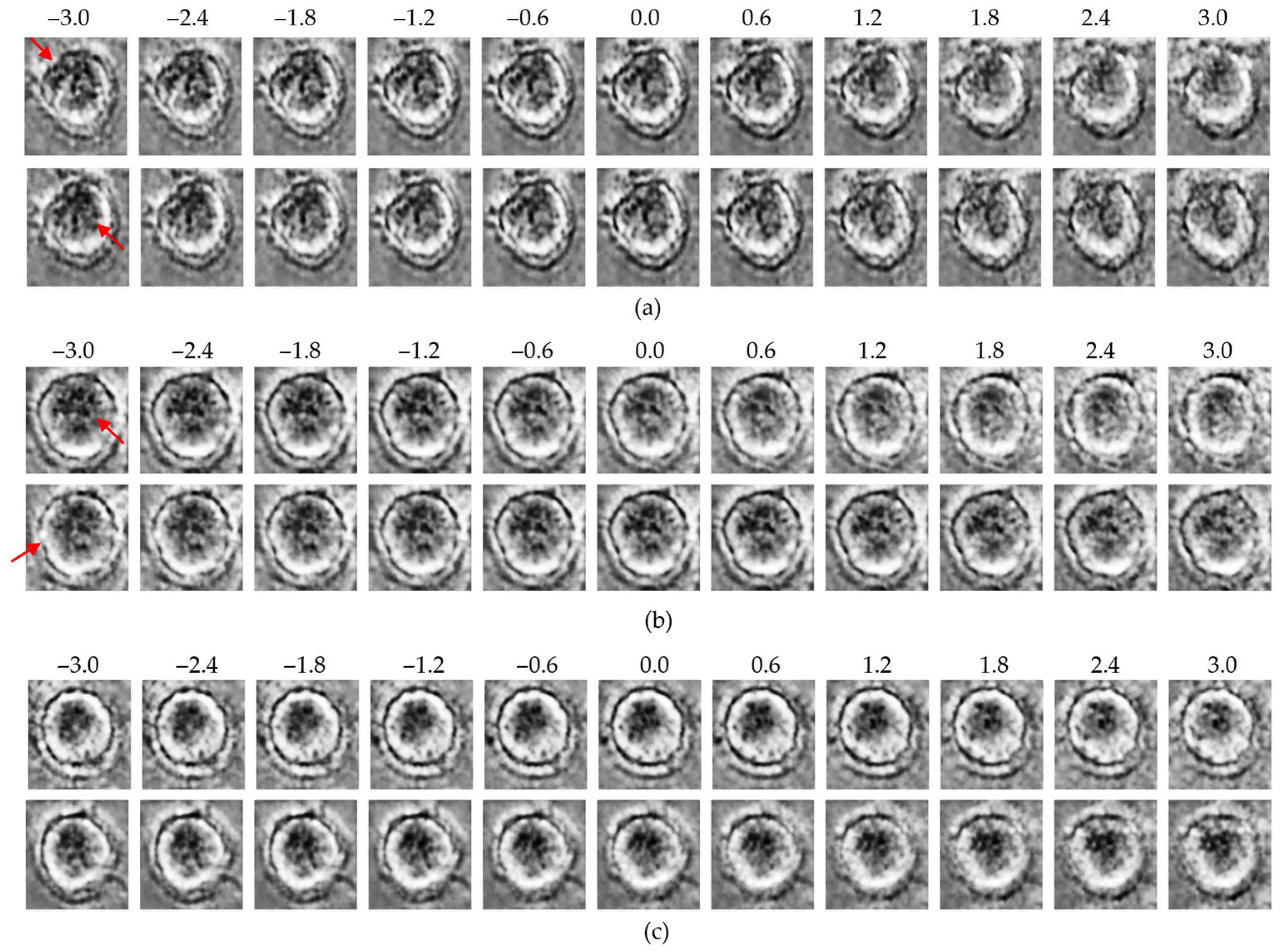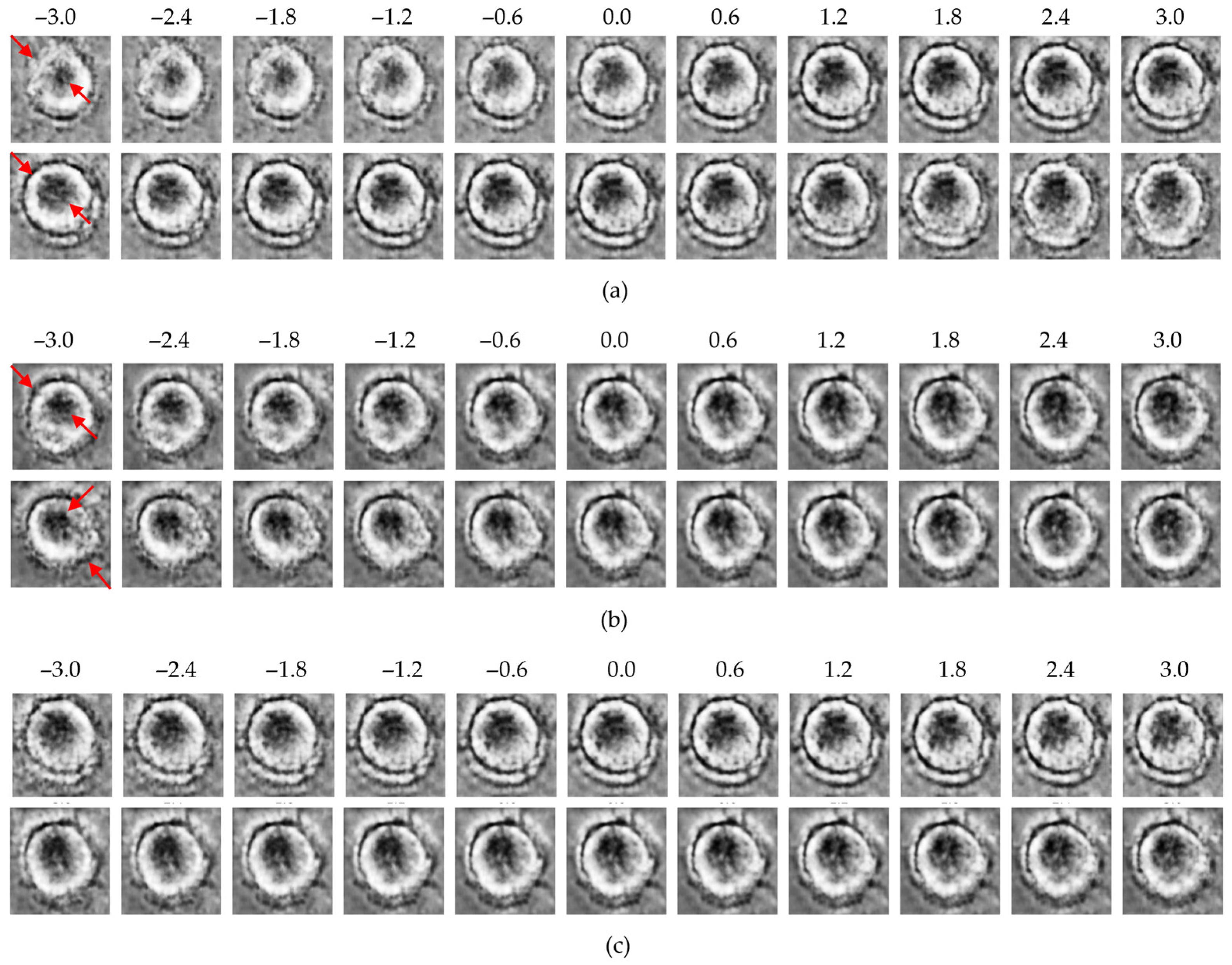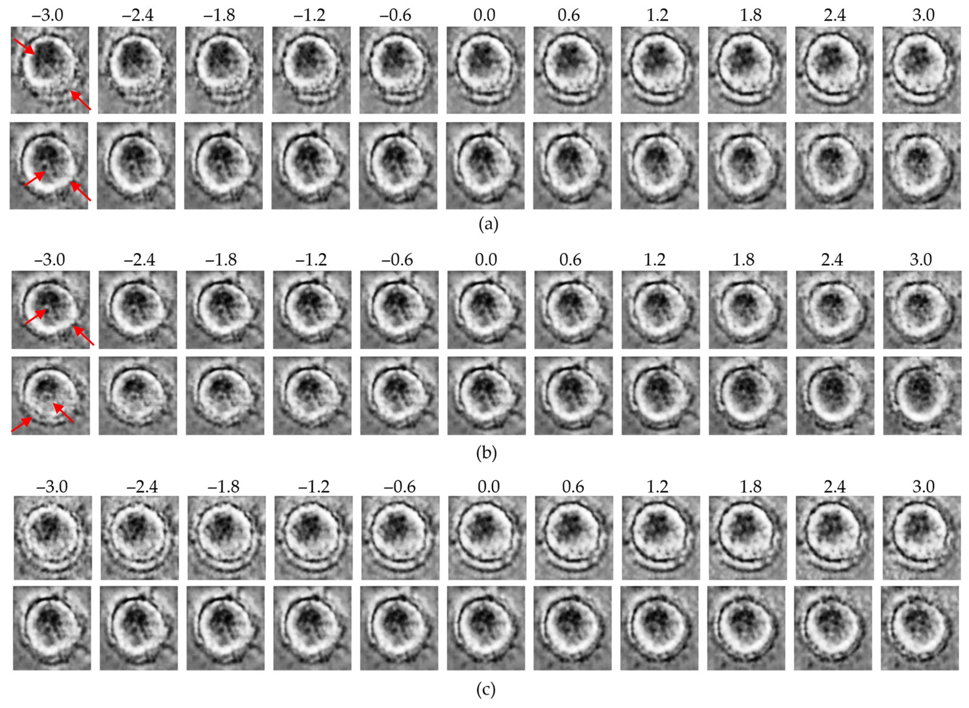 Latent traversal results from the β-TCVAE model: (a) control group traversals along high-effect latent dimensions (z25, upper row; z20, lower row); (b) MNP-treated group traversals along the same dimensions (z25, upper row; z20, lower row); (c) traversal along the low-effect dimension (z24; upper: control, lower: MNP). Red arrows indicate regions with the most significant morphological variations observed during the latent space traversal.