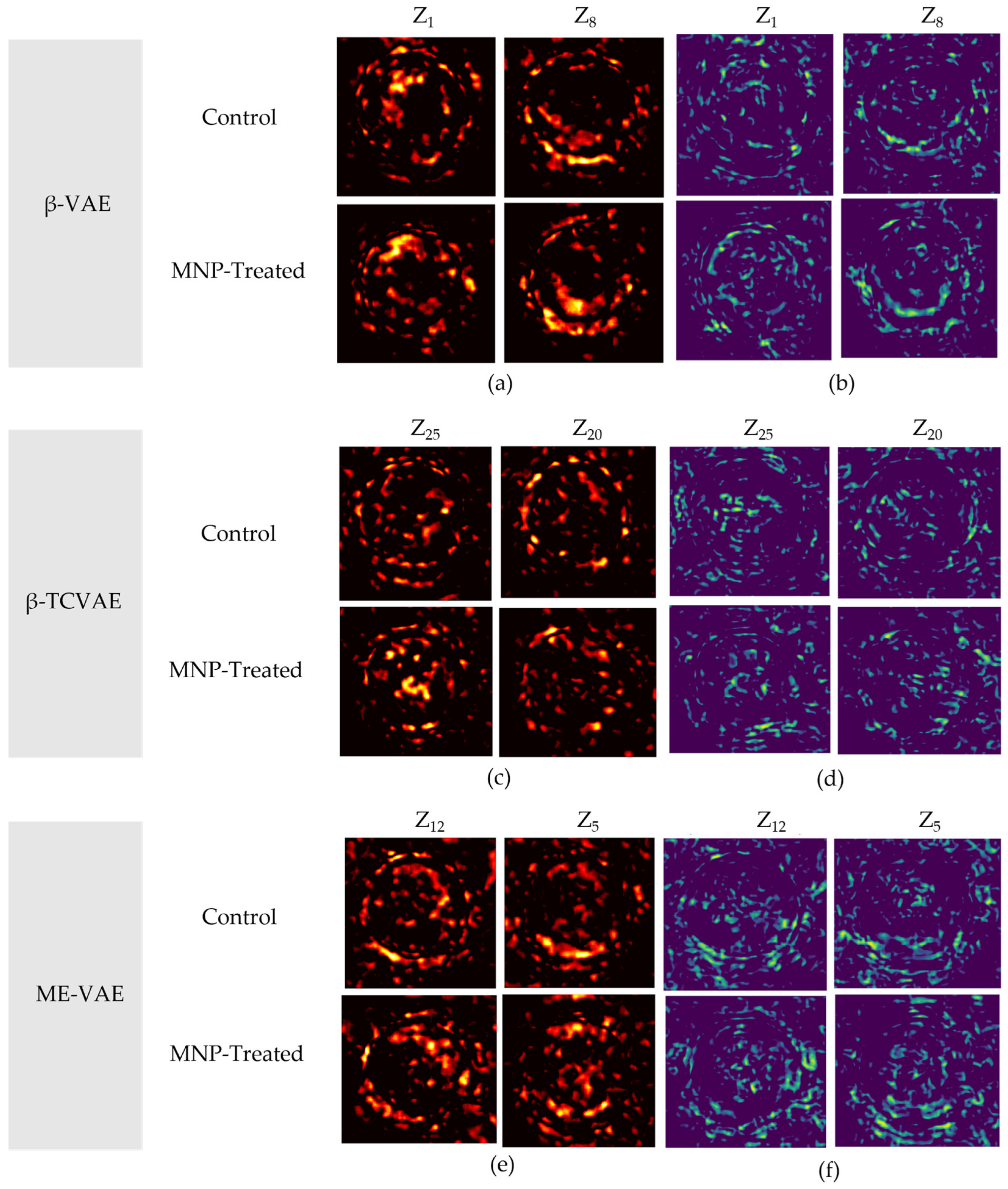 To analyze macrophage morphological variations induced by MNP treatment, three unsupervised learning frameworks based on VAEs were employed: β-VAE, β-TCVAE, and ME-VAE. The overall architectures of these VAE-based models are presented in