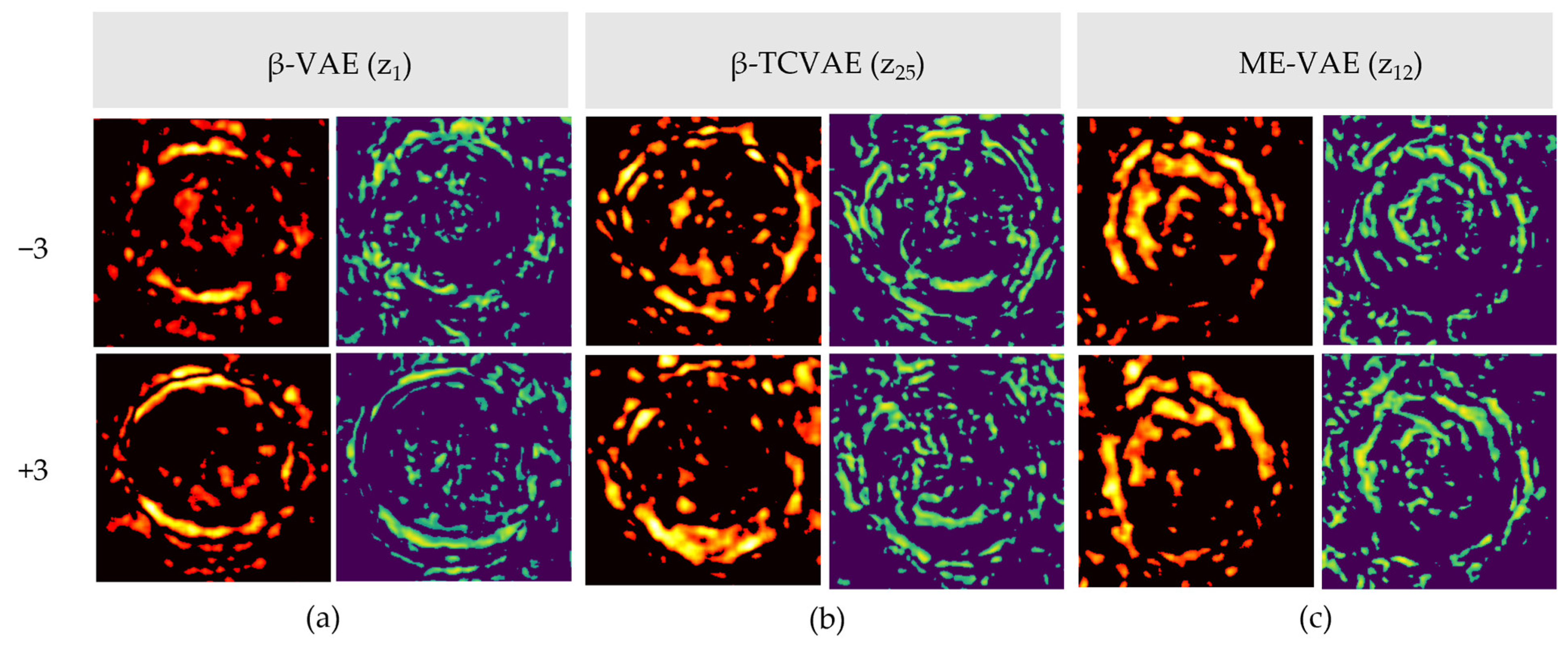Difference map analysis for low-effect latent dimensions across the VAE-based models: the (a) β-VAE (z24), absolute (left) and SSIM (right) difference maps; (b) β-TCVAE (z24), absolute (left) and SSIM (right) difference maps; (c) ME-VAE (z31), absolute (left) and SSIM (right) difference maps.