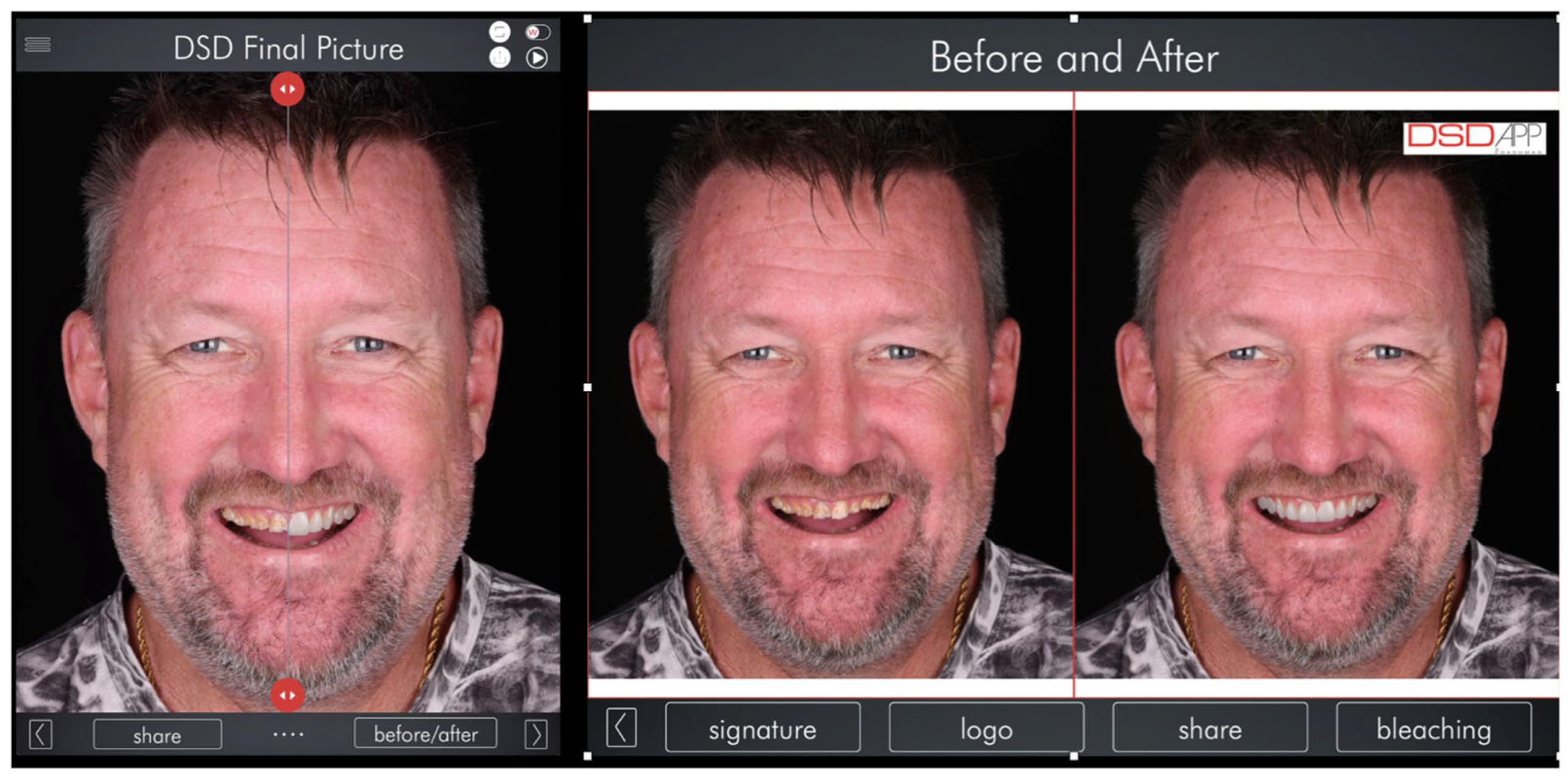 - Cervino, G.; Fiorillo, L.; Arzukanyan, A.V.; Spagnuolo, G.; Cicciù, M. Dental Restorative Digital Workflow: Digital Smile Design from Aesthetic to Function. Dent. J. 2019, 7, 30. [Google Scholar] [CrossRef]