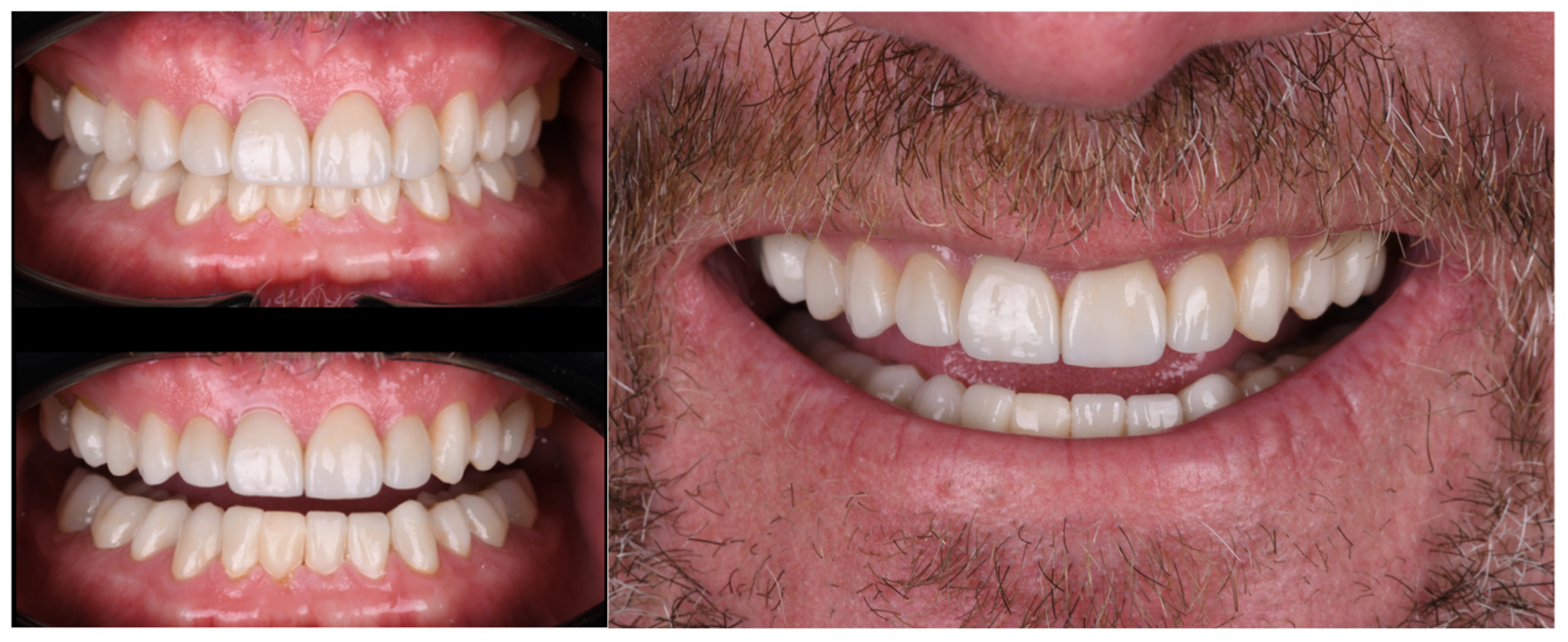 - Lanis, A.; Gallucci, G.; Pedrinaci, I. Full mouth oral rehabilitation of a severely worn dentition based on a fully digital workflow. J. Esthet. Restor. Dent. 2023, 35, 596–608. [Google Scholar] [CrossRef] [PubMed]
