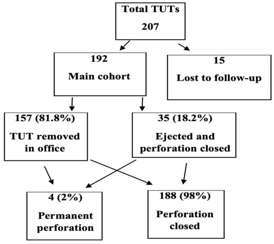 Study flow chart. Of 207 ears treated with Tympanostomy U-Tube (TUT), 15 were lost to follow-up. Among the 192 ears in the main cohort, 157 (81.8%) underwent elective removal in the office, while 35 (18.2%) were spontaneously ejected with perforation closure. Only 4 ears (2%) developed permanent perforation.