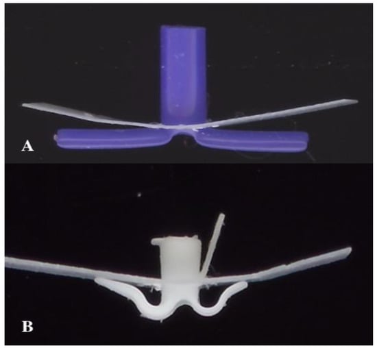 Biomechanical design comparison. (A) Conventional long-term tympanostomy tube (T-tube) showing direct flange contact with the perforation rim. (B) Tympanostomy U-Tube (TUT) demonstrating the arched arms maintaining distance from the perforation rim, with only small pedicles in contact, redistributing pressure away from the critical healing zone.