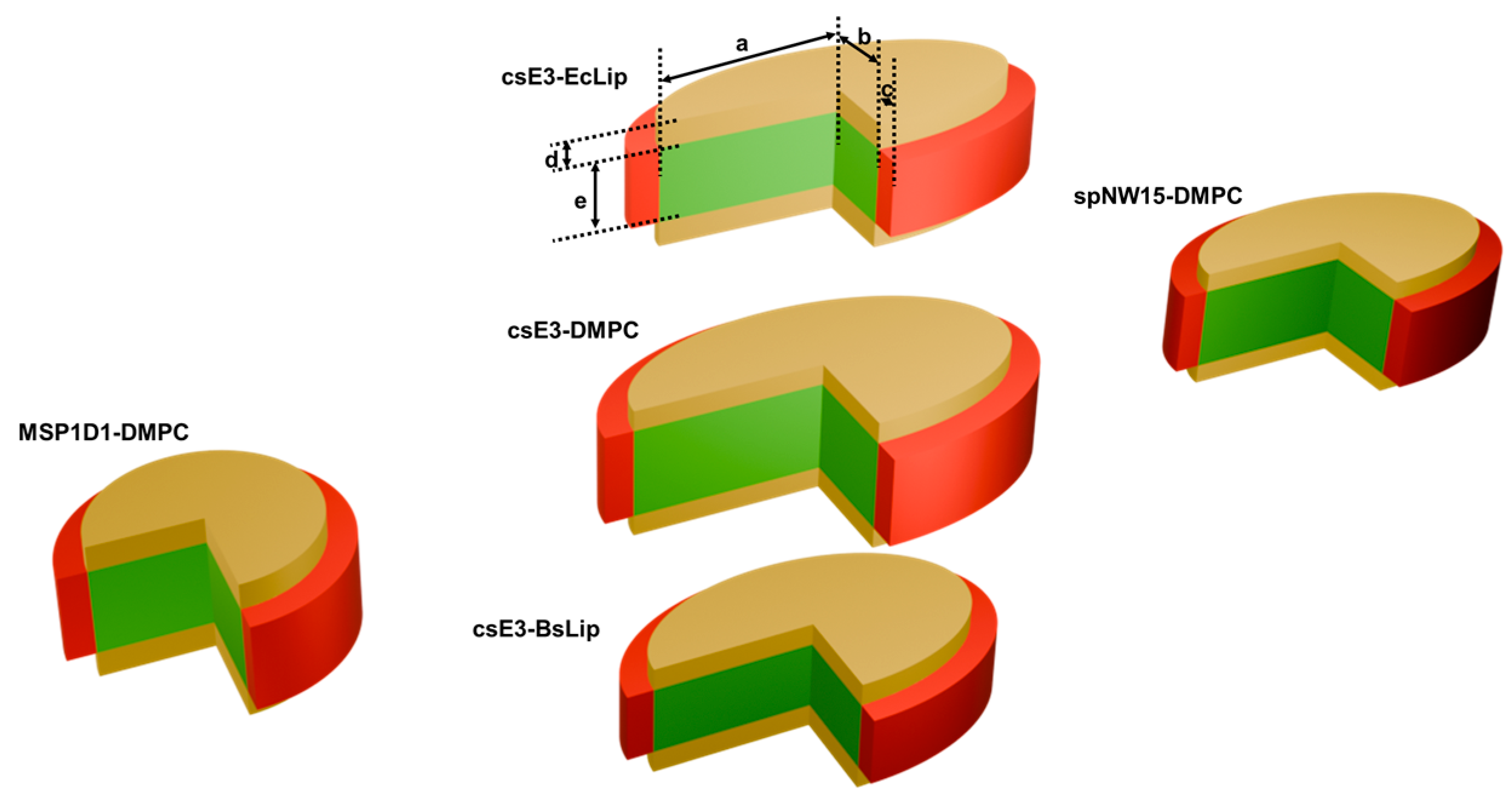 | a-Radius | b/a-Radius Factor | c-Rim Thickness | d-Face Thickness | e-Length | Tails | Headgroups | Belt Protein | Solvent | ||||