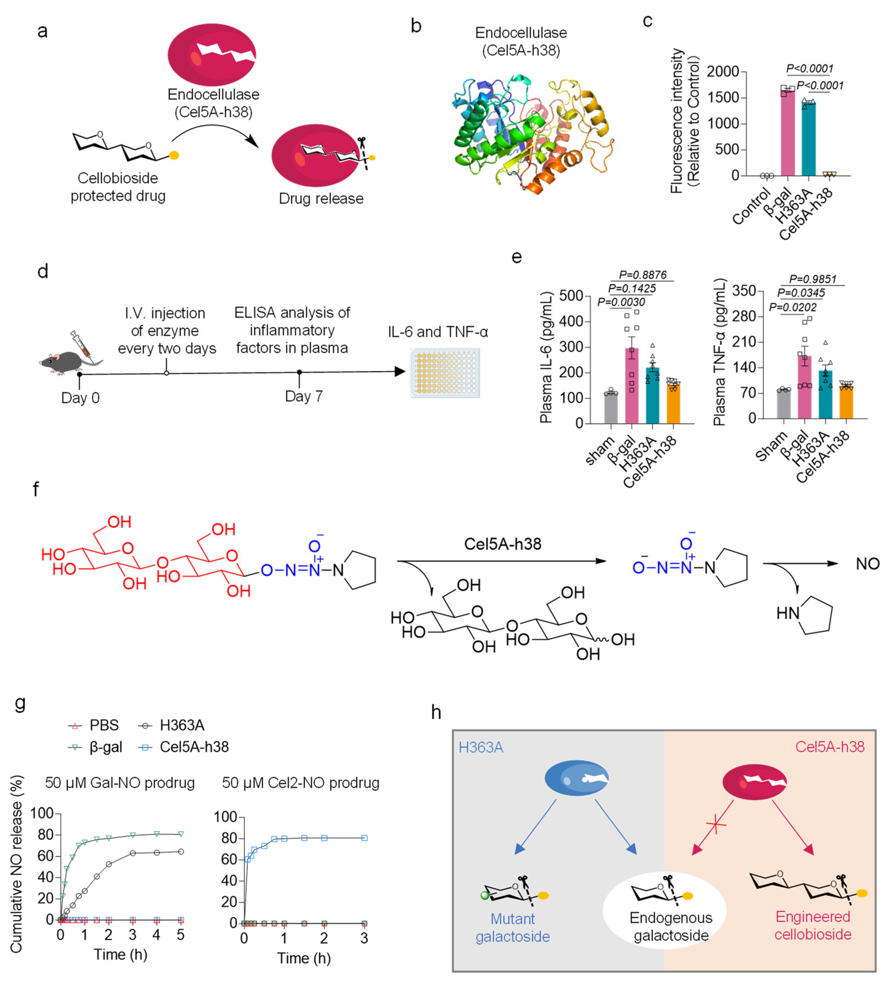 - He, B.; Zhang, Y.; Liu, H.; Tang, M.; Yang, K.; Cheng, S.; Shen, J.; Wei, Y.; Deng, W.; Zhao, Q.; et al. An Endocellulase-Triggered NO Targeted-Release Enzyme-Prodrug Therapy System and Its Application in Ischemia Injury. Adv. Healthc. Mater. 2024, 13, 2401599. [Google Scholar] [CrossRef] [PubMed]