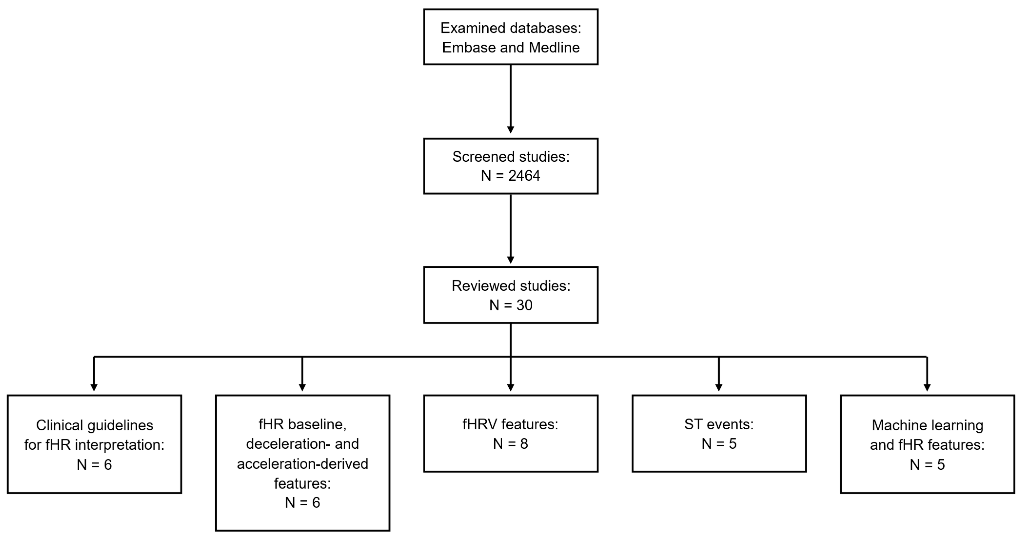 | Francis et al. (2024) [14] | • 9923 total fetuses from 36 studies • Use of different definitions for acidemia (e.g., UA pH ≤ 7.05) • Use of intrapartum CTG tracings | • Scoping review investigating how machine learning has been used to analyze CTG tracings and predict acidemia • Investigation of the used datasets, machine learning algorithms, and fHR features • Systematic search and screening performed based on eligibility criteria to ensure an unbiased selection of studies | • The use of different definitions for acidemia, datasets, and fHR features prevented a direct comparison of the results achieved in different studies | • Inclusion only of studies investigating the intrapartum period, published in English, after the year 2000, and in journals |