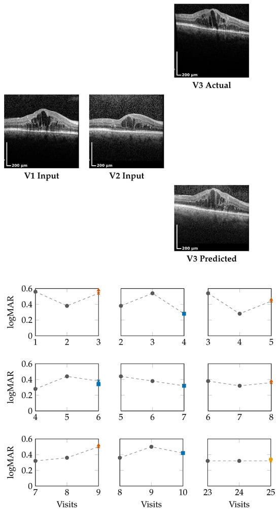 Each input window includes full 3D OCT volumes from 49 B-scans per visit, resized to a resolution of . These volumes are processed by the generator to synthesize the future visit’s B-scans. For logMAR prediction, a separate LSTM-based regression head consumes the same historical window to forecast the scalar logMAR value corresponding to the predicted scan.