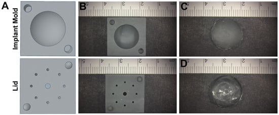 Two-piece negative molds (Figure 1) were developed through computer-aided design with TinkerCAD (Autodesk, San Francisco, CA, USA), an open-source online 3D-design platform. The bottom mold (“Implant Mold”) contained a negative hemispherical imprint of the implant, while the mold cover (“Lid”) contained airholes to allow even curing of the silicone with protruding nodes to secure the two pieces together. The molds were 3D printed using stereolithography of Grey Photoreactive Resin (Formlabs, Somerville, MA, USA), a methacrylic acid ester-based product, on a Formlabs 3B+ printer (Formlabs). The molds were printed utilizing adaptive layering, resulting in molds with a layer resolution of up to 0.025 mm. This allowed for reduced print duration and a smooth, ridge-free surface. Mold dimensions used in this study to accommodate female Lewis rats (described in more detail later) had a hemisphere radius of 6.55 mm, resulting in a volume of 589 mm3 and a surface area of 404 mm2.