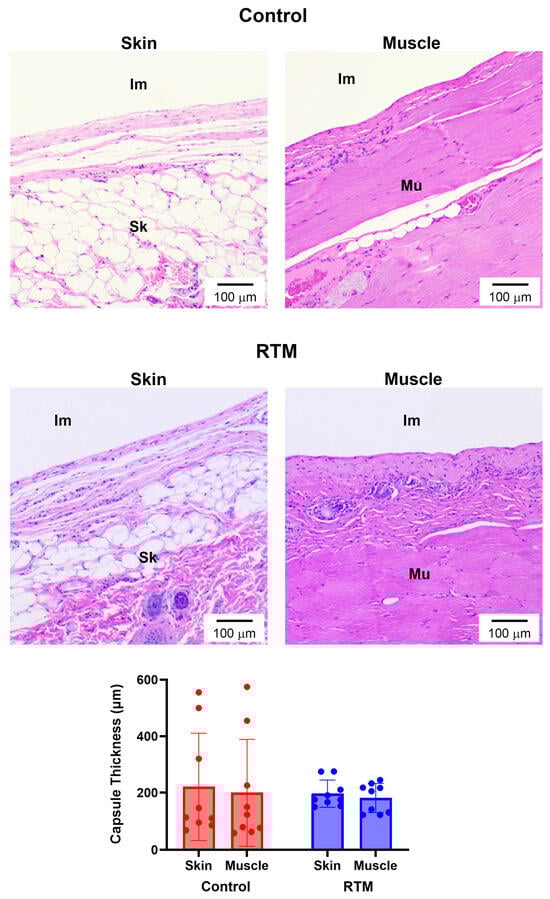 RTM coverage does not affect breast implant capsule thickness. Representative H&E-stained sections at 10× magnification comparing capsules formed around control and RTM-wrapped implants at the skin and muscle surfaces at 12 weeks. Scale bars = 100 µm. “Im” indicates implant, “Sk” indicates skin, and “Mu” indicates muscle. Quantification of capsule thickness (µm) is shown at the bottom. Data represented as mean ± SD (n = 10/group).