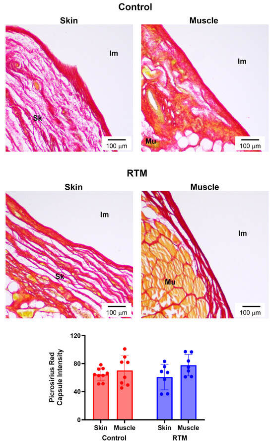 RTM coverage does not affect breast implant collagen density. Representative picrosirius red-stained sections at 10× magnification comparing capsules formed around control and RTM-wrapped implants at the skin and muscle surfaces at 12 weeks. Scale bars = 100 µm. “Im” indicates implant, “Sk” indicates skin, and “Mu” indicates muscle. Quantification of collagen density is shown at the bottom. Data represented as mean ± SD (n = 10/group).