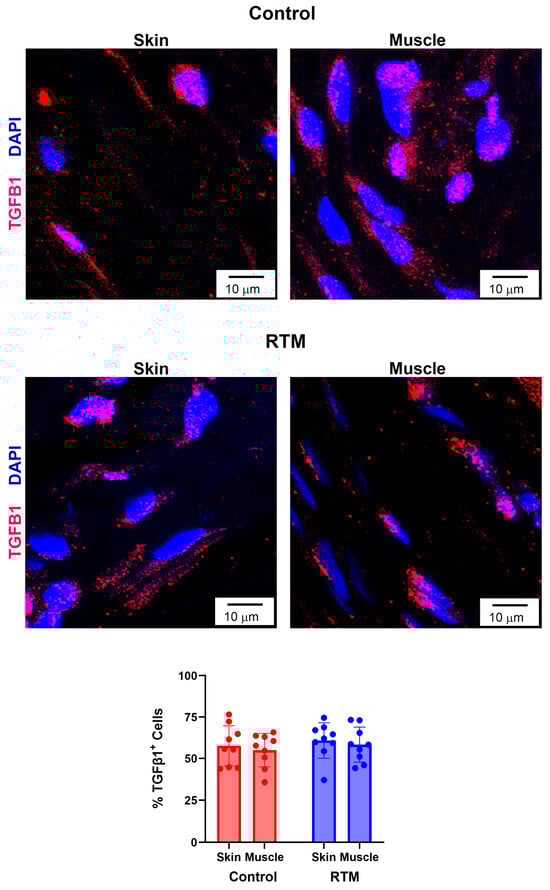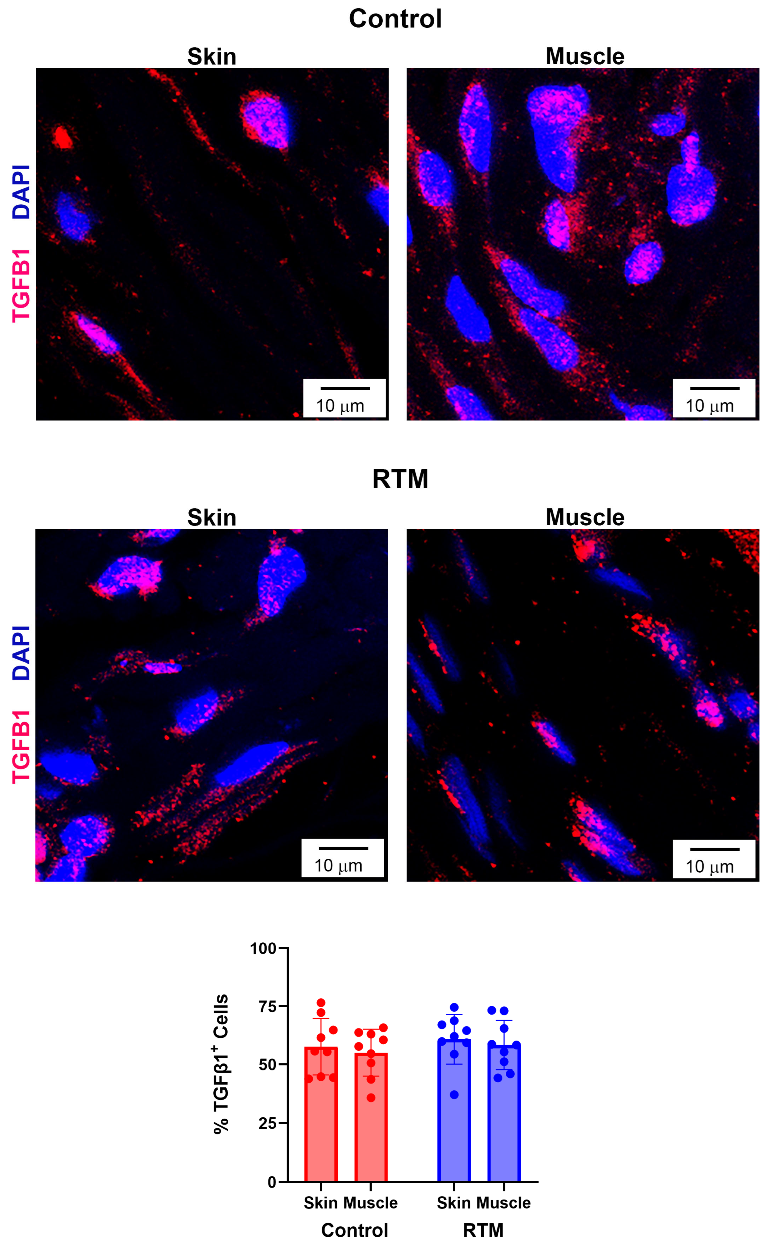 Immunohistochemical and picrosirius red staining were utilized to evaluate differences in RTM-wrapped vs. control implants from these harvested tissues. While the skin groups had relative lower collagen density for capsule intensity in comparison to their respective muscle groups (control: 64.6 ± 9.3 vs. 70.2 ± 20.9; RTM: 60.7 ± 18.3 vs. 77.7 ± 15.2), the main effects of both the implant group (p = 0.76) and the tissue type (p = 0.07) were not statistically significant (Figure 7). However, contractile fibroblasts demonstrated changes from RTM coverage. The implant group was statistically significant (p = 0.03), whereas the main effect of the tissue type was not significant (p = 0.88) (Figure 8). Compared to the control implant groups (skin: 7.7 ± 2.6%, muscle: 8.0 ± 3.1%), the RTM groups (skin: 6.2 ± 1.8%, muscle: 5.7 ± 1.9%) had significantly fewer contractile fibroblasts, suggesting less fibrosis. Finally, TGF-β1 expression was not different. The main effects of the implant group (p = 0.80) and the tissue type (p = 0.49) were not statistically significant (Figure 9). Both groups had cells expressing TGF-β1 (~35–75% range of cells expressing TGF- β1 among groups and tissue type).