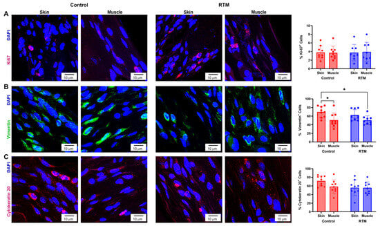 RTM-wrapped vs. control implants were also evaluated for pathologic cellular responses during the foreign body response to the implants. The main effects of the implant group (p = 0.88) and the tissue type (p = 0.93) were not statistically significant for cell proliferation (Figure 12A). (Ki-67: p = 0.88; vimentin: p = 0.39; cytokeratin 20: p = 0.07) (Figure 12A). The main effect of the tissue type was significant for vimentin (p = 0.001), demonstrating decreased vimentin from the muscle compared to the skin (Figure 12B); post hoc tests for vimentin showed statistically significant differences when comparing the control skin group (69.7 ± 12.6%) to both the control muscle group (50.8 ± 16.5, p = 0.02), as well as the RTM muscle group (50.5 ± 10.1, p = 0.02). However, there were no differences in vimentin due to the implant group (p = 0.39). Finally, no changes were found in cytokeratin in the implant group (p = 0.07) or the tissue type (p = 0.19) (Figure 12C).