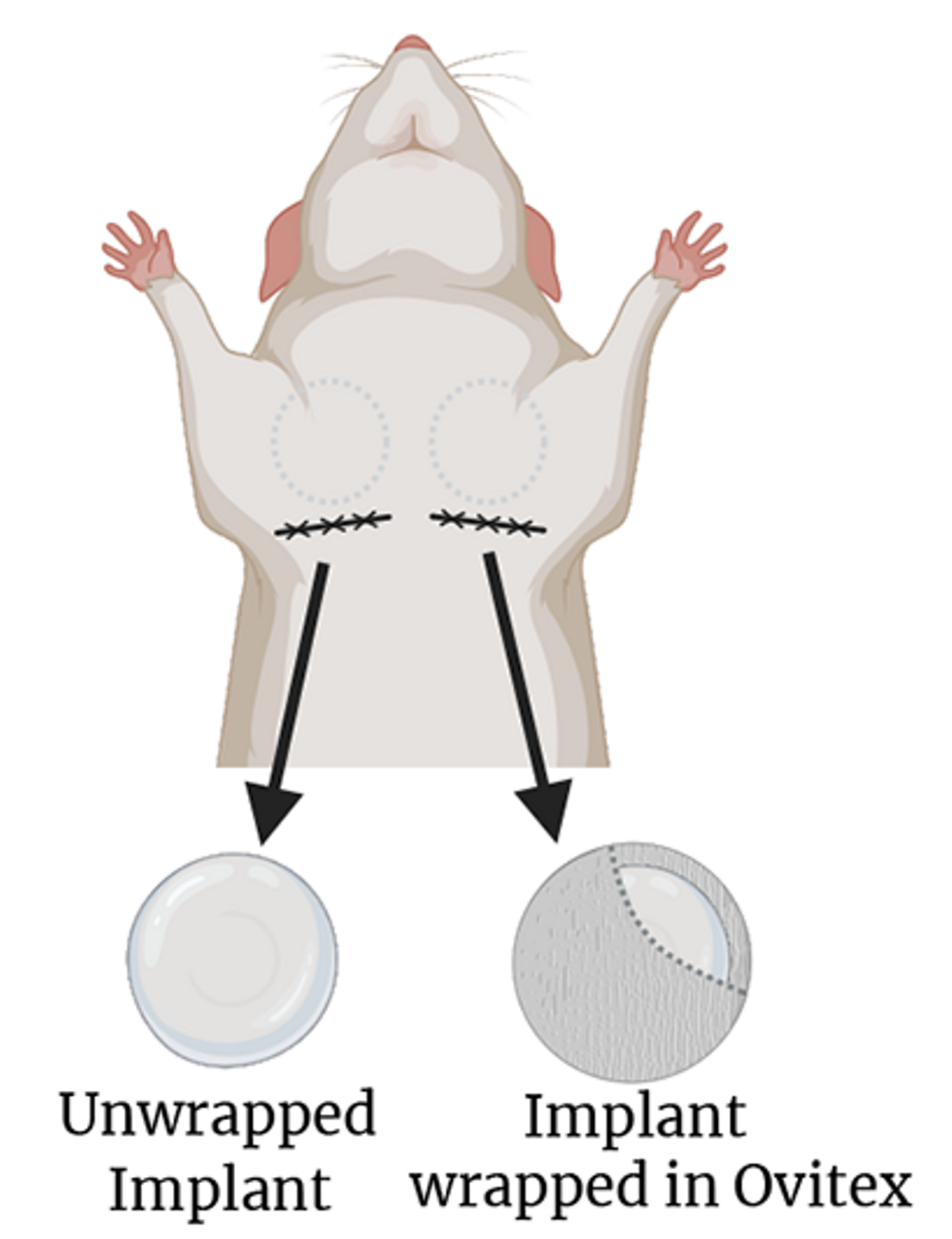 Commercially available adult female Lewis rats (200 g, Charles River Laboratories, Wilmington, MA, USA) were utilized in this experiment. Surgical procedures and peri-operative care measures were conducted in compliance with the AAALAC accredited Washington University Institutional Animal Care and Use Committee (IACUC) and the National Institutes of Health guidelines. All animals were housed in a central animal care facility and provided with food (PicoLab rodent diet 20, Purina Mills Nutrition International, St. Louis, MO, USA) and water ad libitum. For the experimental design, two (2) hemispherical silicone breast implant prototypes were inserted bilaterally into the rat in the prepectoral plane. For studies involving RTM surrounding the implant, the left-sided implant was completely wrapped in 2-layer OviTex PRS (OviTex® PRS by TELA Bio, Malvern, PA, USA) using a purse-string suture technique before implantation. Both implants were harvested at a 12-week endpoint for histological evaluation.