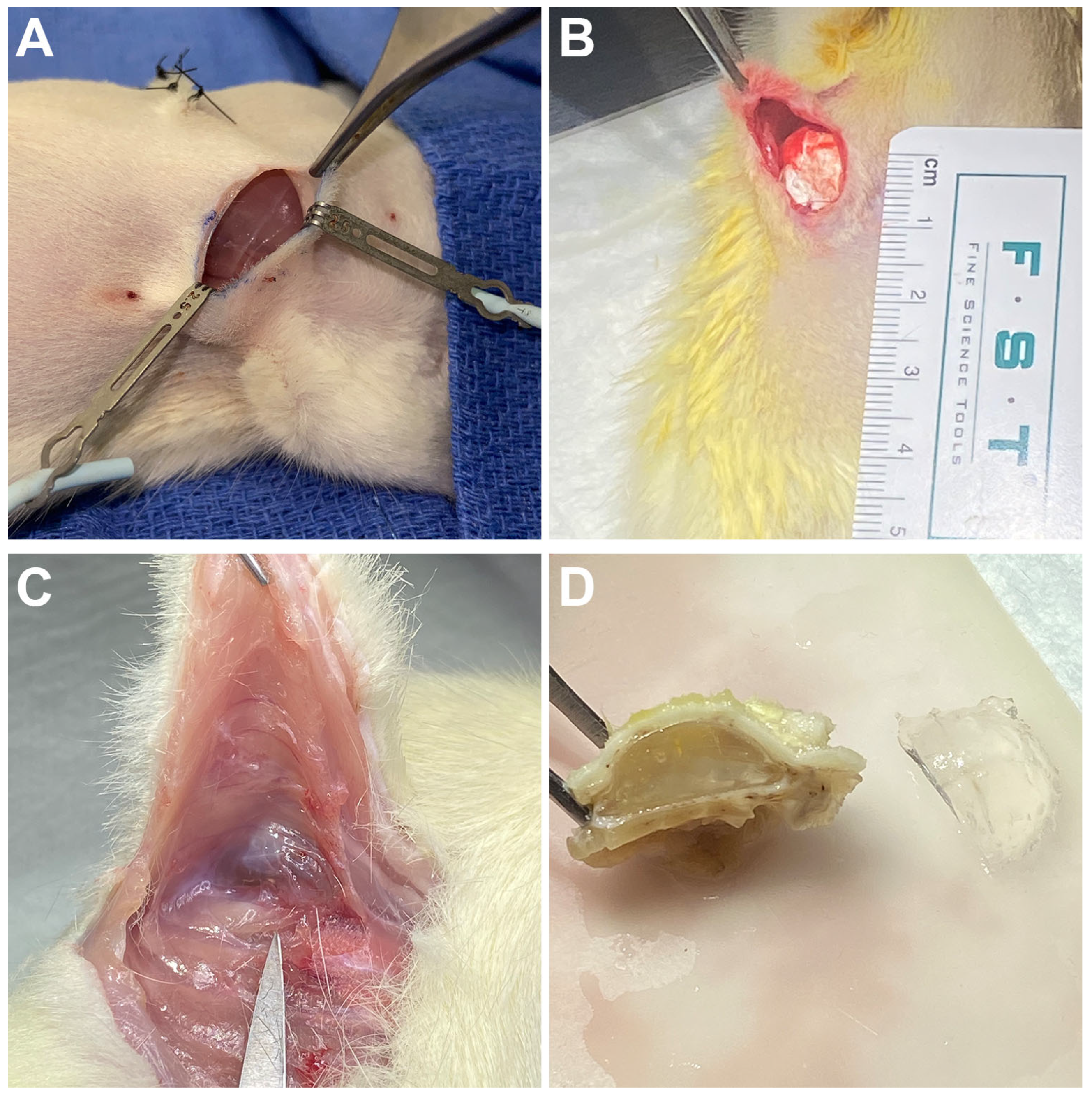 Implantation and harvest of stiff silicone implants in rats. Implants were inserted bilaterally using horizontal skin incisions at the inferior aspects of the pectoralis major muscles (A,B). After 3 months, the implants and surrounding tissue were harvested en bloc to retain the structure of the capsule and surrounding tissue for histological analysis (C,D).