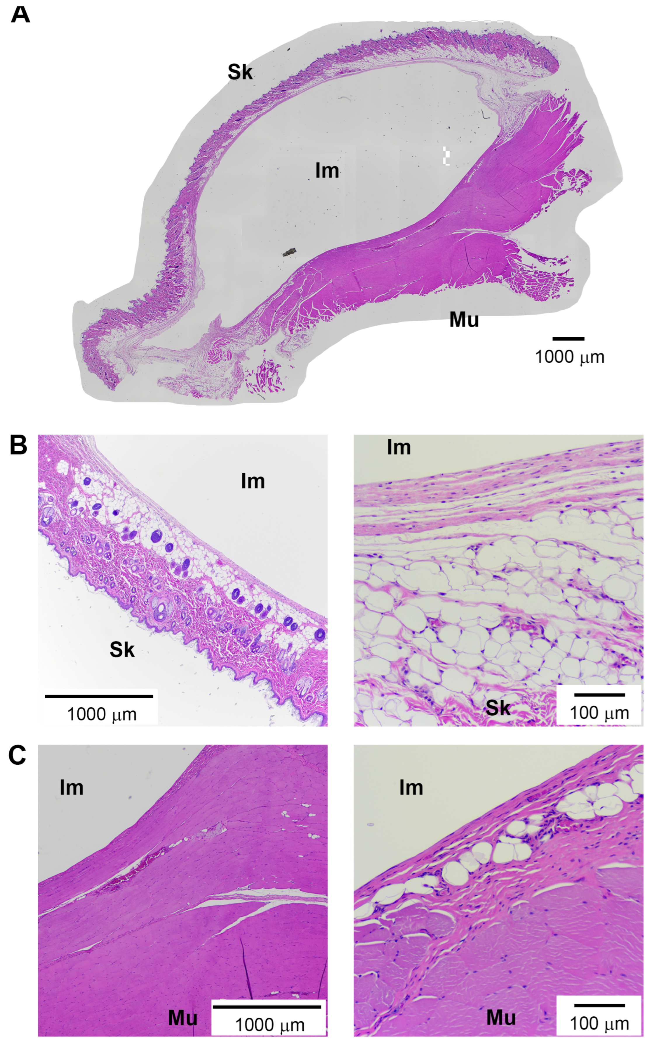Histologic overview of breast implant capsule formation in the novel rat model. Representative images of an implant capsule from hematoxylin and eosin (H&E) staining. A complete view of the tissue surrounding the implant demonstrated a thin capsule surrounding the skin and muscle borders (A). Enhanced magnification revealed the capsule forming at the border of the implant (now removed) and skin (B) or muscle (C). Scale bars as indicated in each panel. “Im” indicates implant, “Sk” indicates skin, and “Mu” indicates muscle.
